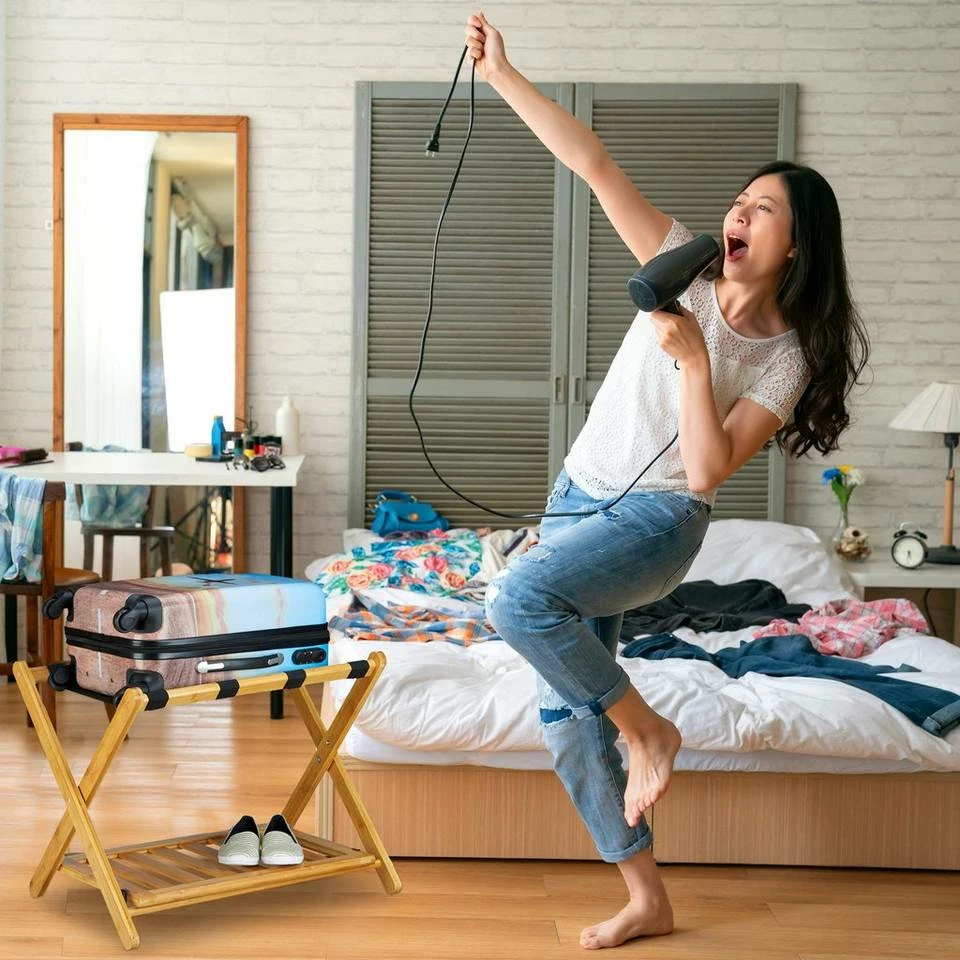 Kofferständer mit Ablage Mit dem Kofferständer wird das Packen bequemer. Reisetaschen und Koffer befüllen Sie damit in angenehmer Höhe. Damit schonen Sie nicht nur ihren Rücken, weil das lästige Bücken entfällt. Ihre Taschen haben auch mehr Halt als auf einem Stuhl oder dem Bett. Die Gepäckablage eignet sich besonders für Vielurlauber oder Geschäftsreisende. Auch Ferienhäuser oder Hotels bieten Ihren Gästen somit mehr Komfort. Auf der extra Ablage über dem Boden findet sich zusätzlicher Stauraum für Schuhe oder ähnliches. Bei Nichtgebrauch können Sie den Kofferständer zudem platzsparend vertauen.