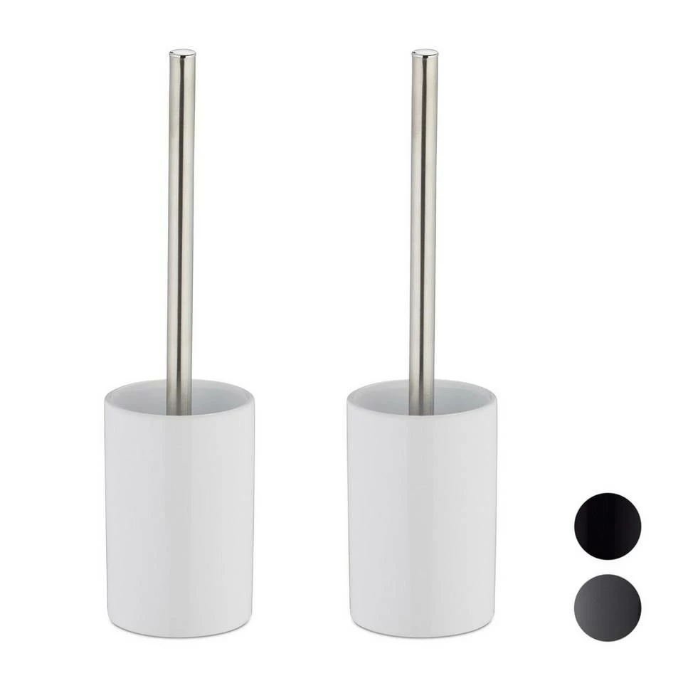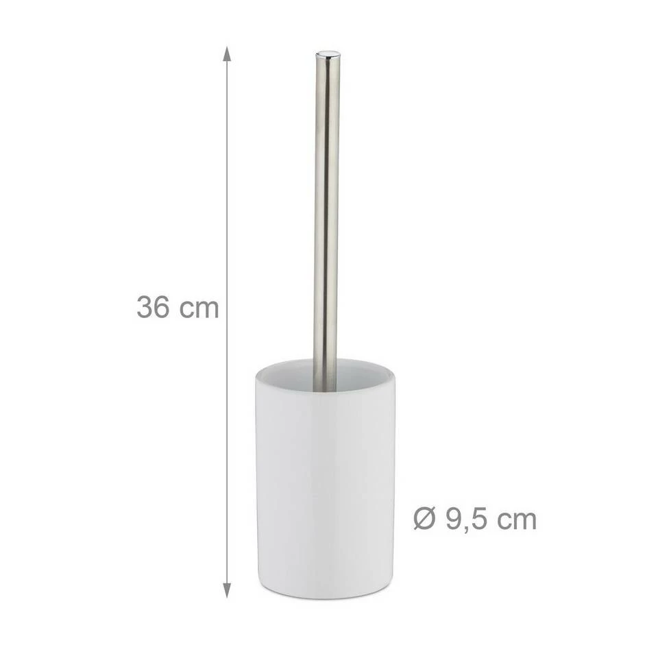 2x WC-Bürstengarnitur für Ihr Bad Die WC-Garnitur umfasst einen Bürstenhalter und die passende Toilettenbürste. Das WC-Set lässt sich im Bad oder Gäste-WC sehr flexibel ohne Bohren positionieren. Der Keramikbehälter ist mit einem nassen Lappen im Handumdrehen gereinigt und punktet mit seiner schnörkellosen Optik. Auch der Bürstengriff fügt sich mit seiner matten Metalloberfläche sehenswert ein. Sollte sich der Bürstenkopf einmal abgenutzt haben, tauschen Sie ihn einfach gegen einen neuen aus. Der passende Ersatzbürstenkopf ist das Relaxdays-Modell 10021026 (ca. 12 mm großes Innengewinde, Gesamtgröße ca. 8 cm).