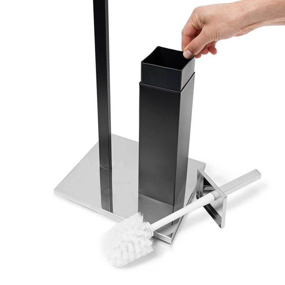 WC-Garnitur aus mattem Stahl Diese WC-Garnitur besticht durch ihr modernes, minimalistisches Design. Der matte, schwarze Stahl ist kaum schmutzempfindlich und weniger anfällig für Fingerabdrücke. In Kombination mit der glänzenden Bodenplatte aus verchromtem Stahl wirkt die Standgarnitur in jedem Bad sehr elegant. Die WC-Bürste mit wechselbarem Kopf verfügt über einen Griff und einen Spritzschutz. Sie findet ihren Platz im hohen Bürstenhalter, der vollständig mit einem Kunststoff-Einsatz ausgekleidet wird. Dieser lässt sich leicht entnehmen und so schnell und hygienisch reinigen. Achten Sie beim Kauf eines Ersatzbürstenkopfes darauf, dass der Kopf selbst einen Durchmesser von etwa 7 cm und ein Innengewinde von ca. 9,5 mm hat, wie unser Modell 10021023.