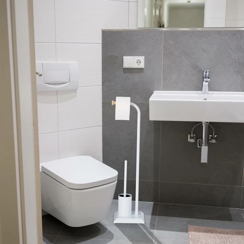 Weiße WC-Garnitur in modernem Design Die edle WC-Garnitur ist das ideale 2 in 1 Modell für das Badezimmer. Die Kombination besitzt einen Behälter für die Klobürste sowie einen Platz für das Toilettenpapier. Der freistehende Klopapierhalter passt dank des viereckigen Standfußes in jede beliebige Ecke. Zudem ist er rutschfest und steht stabil. Das Aussehen überzeugt mit einem modernen Design in leicht glänzendem Weiß. Problemlos tauschen Sie den Bürstenkopf bei dem Halter aus, womit auch die Hygiene sichergestellt ist.