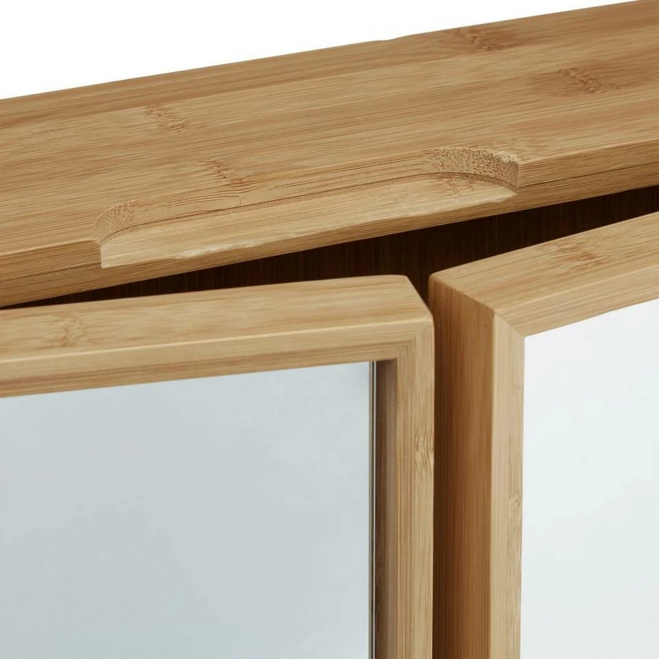 Bad Spiegelschrank für mehr Stauraum Mit dem breiten Spiegelschrank für das Bad haben Sie den vollen Überblick. Der große Spiegel unterstützt Sie beim morgendlichen Herausputzen. Hinter den voll verspiegelten Schranktüren geben zwei individuell einsetzbare Einlegeböden Raum für Zahnputzbecher, Cremes und Hygieneartikel. Der robuste Wandschrank ist aus langlebigem Bambus gefertigt. Das widerstandsfähige Material absorbiert Feuchtigkeit und ist somit für das Badezimmer und andere Feuchträume bestens geeignet. Der naturfarbende Hängeschrank beweist mit seinen asymmetrischen Türen ohne Griff Stil und fügt sich in jede Einrichtung ein.