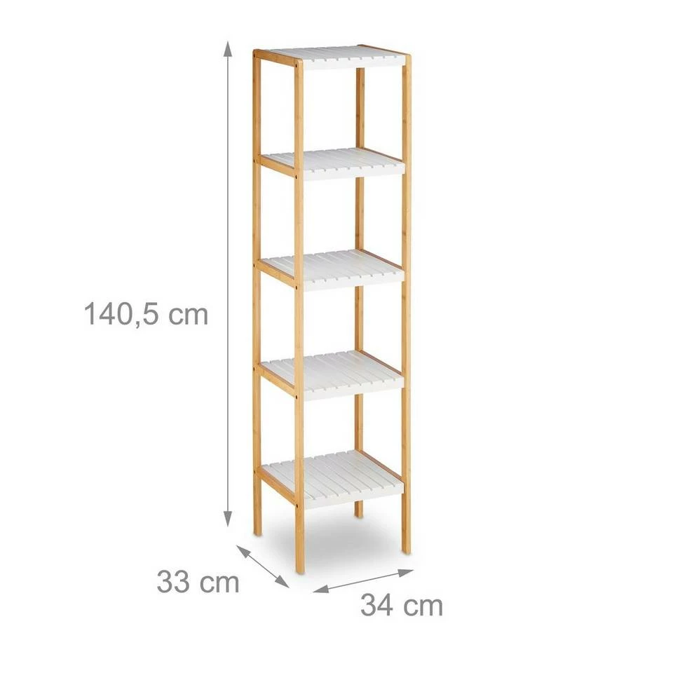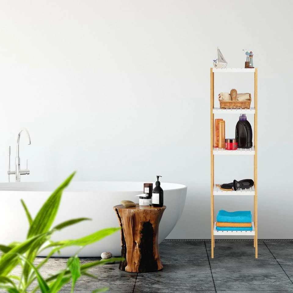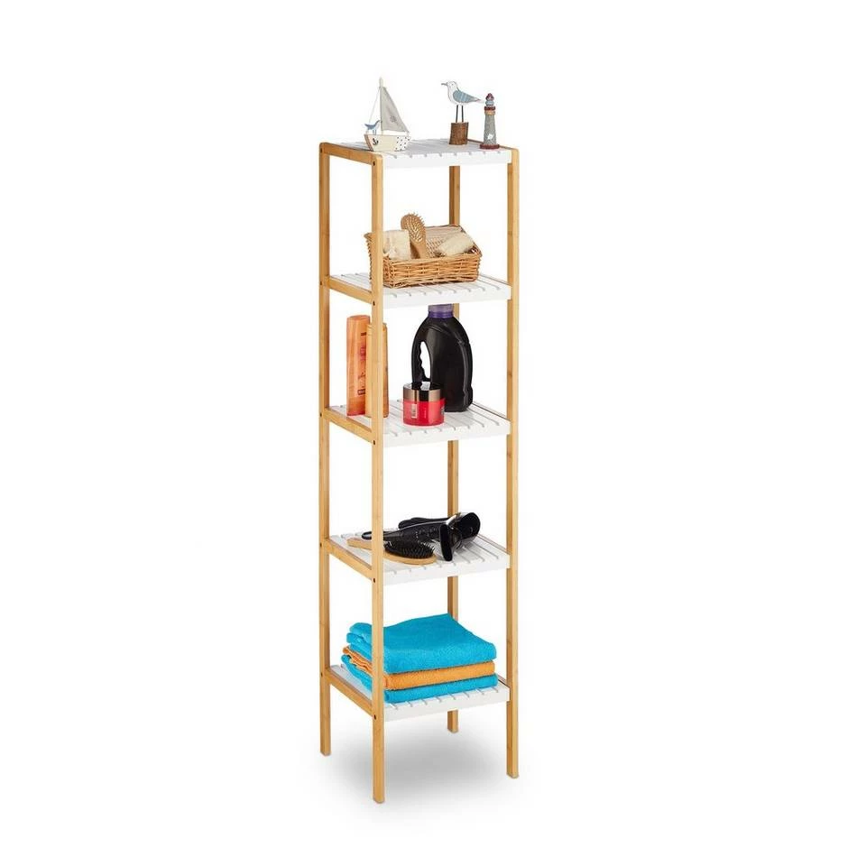 Hohes Beistellregal für Zuhause Das platzsparende Standregal ist ein kleines Stauraum-Wunder, auch in kleinen Badezimmern. Auf den 5 offenen Ebenen bringen Sie Föhn, Zahnputzbecher, Kosmetik, Handtücher und noch mehr griffbereit und übersichtlich unter. Der Mix aus weißen Ablagen und natürlichem Bambus sorgt für einen freundlichen Look. Das feuchtigkeitsresistente Material ist dabei insbesondere für Feuchträume, wie Bad, Küche oder Waschraum, geeignet. Zudem punktet das Regal mit seinem einfachen und unkomplizierten Aufbau.