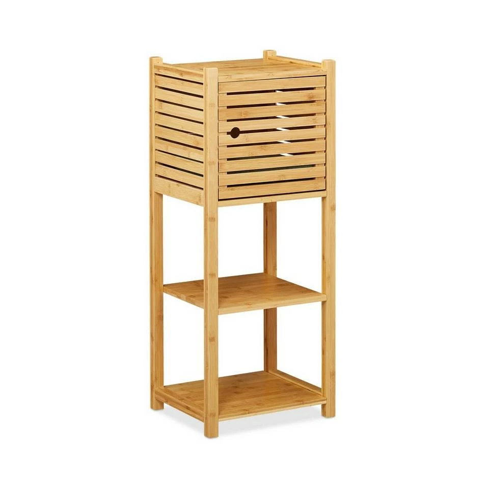 Niedriges Regal aus natürlichem Bambus Holen Sie sich für Ihr Badezimmer zusätzlichen Stauraum. Das schicke Ablageregal punktet mit 4 Ebenen, worauf Handtücher, Kosmetik, Haartrockner und andere Badutensilien übersichtlich untergebracht werden können. Ein Fach des Bambusregals besitzt eine Tür mit Magnetverschluss, hinter der Sie unter anderem Hygieneartikel diskret verstauen können. Das natürliche Design aus robustem Bambus ist feuchtigkeitsresistent und daher für das Bad, die Küche oder den Waschraum besonders gut geeignet.