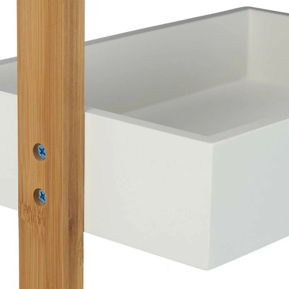Holzregal mit 3 Körben Sie haben ein kleines Bad oder in Ihrer Küche oder Werkstatt nur wenig Platz? Mit diesem kleinen Badregal aus Bambus und MDF schaffen Sie im Handumdrehen neuen Stauraum. Dafür stehen Ihnen insgesamt 3 weiße Ablagekörbe in verschiedener Größe zur Verfügung. Der unterste Korb ist der größte, der oberste der kleinste, sodass ein stabiler Stand gewährleistet ist. Der Ablageständer ist dank des Griffs und seines geringen Gewichts gut zu transportieren.