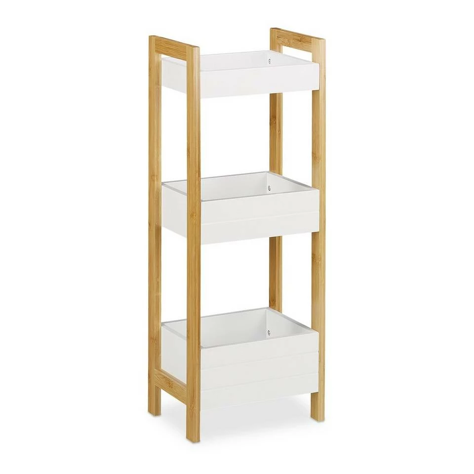 Modernes Beistellregal für Bad, Küche und mehr Schaffen Sie zusätzlichen Stauraum im Badezimmer mit diesem modernen Standregal. In 3 unterschiedlich großen Körben können Kosmetika, Handtücher, Toilettenpapier und mehr übersichtlich und griffbereit verstaut werden. Das schmale Regal ist dabei ideal für kleine Bäder geeignet. Doch auch in der Küche oder im Wohnzimmer macht das freistehende Korbregal eine gute Figur. Die aufregende Kombination des naturfarbenen Bambusgestells mit den weißen Fächern sorgt in jedem Fall für einen Hingucker.