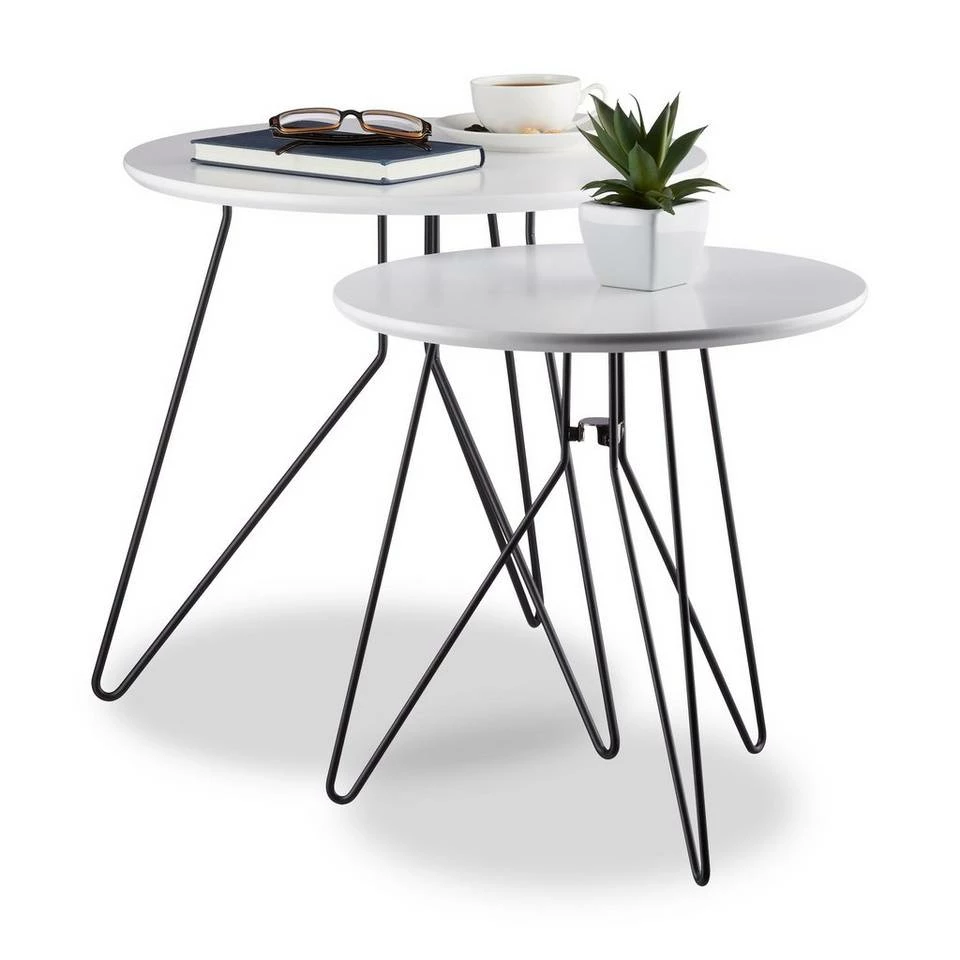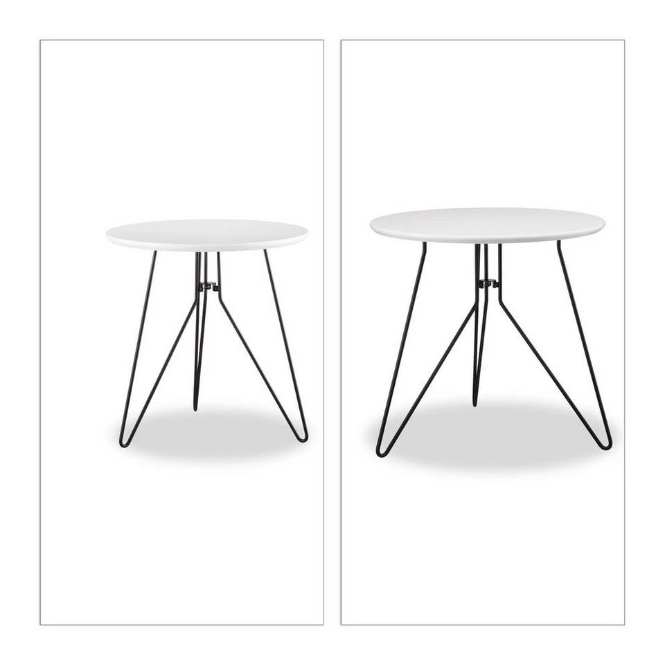 Dekorative Ablagetische in Weiß Die beiden Beistelltische in schlichtem Weiß sind ein Hingucker in jeder Wohnung und dank der unterschiedlichen Größen vielfältig einsetzbar. Nutzen Sie die Tischchen als Nachttisch im Schlafzimmer, Couchtisch im Wohnzimmer oder dekorativen Blickfang im Flur. Die drei Metallbeine sorgen dabei für einen sicheren Stand. Auch als Blumenhocker oder Ablagetisch für Zeitschriften sind die Dekotische bestens geeignet. Das moderne Design der Dreibeiner passt zu jedem Einrichtungsstil.