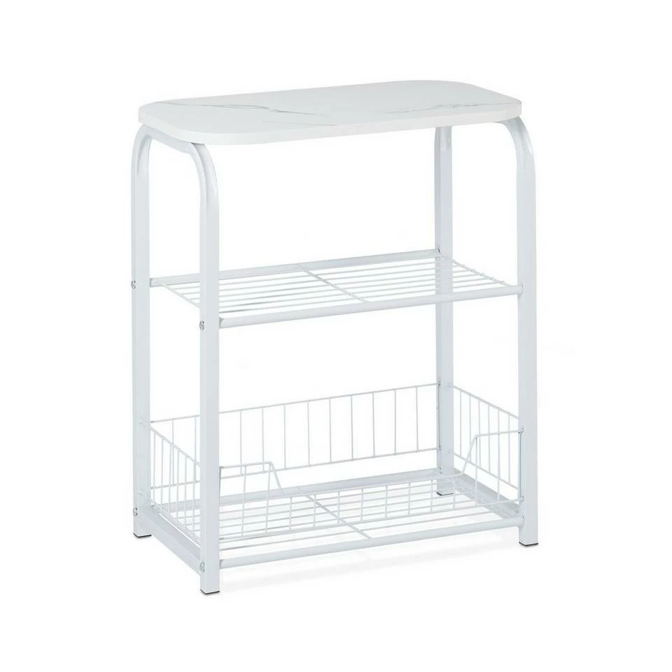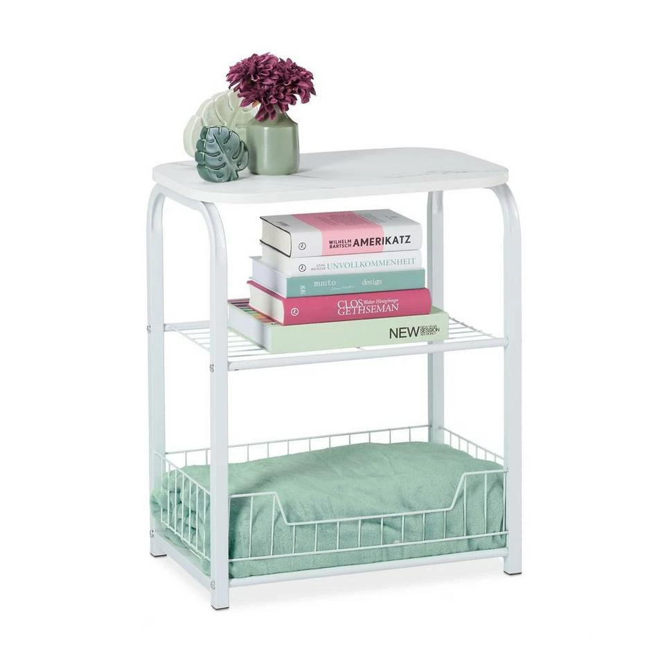 Ablagetisch in Marmor-Optik Dieser praktische Beistelltisch bietet die perfekte Ablagefläche neben Ihrem Sofa. Getränke, kleine Snacks, die Fernbedienung und alles andere, was Sie für einen gemütlichen Filmabend brauchen, können Sie auf der Tischplatte abstellen. Die 2 Ablagen bieten zusätzlich Platz für Decken und Magazine. Auch optisch überzeugt der Wohnzimmertisch mit seinem Mix aus eleganter Marmor-Optik und schlichtem Metall. Setzen Sie mit dem Korbtisch einen stilvollen Eyecatcher in Ihrem Wohnzimmer.