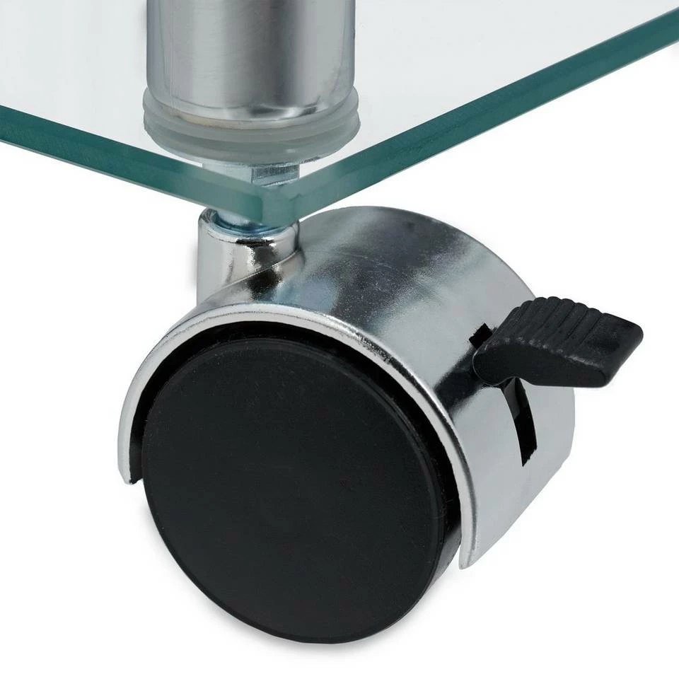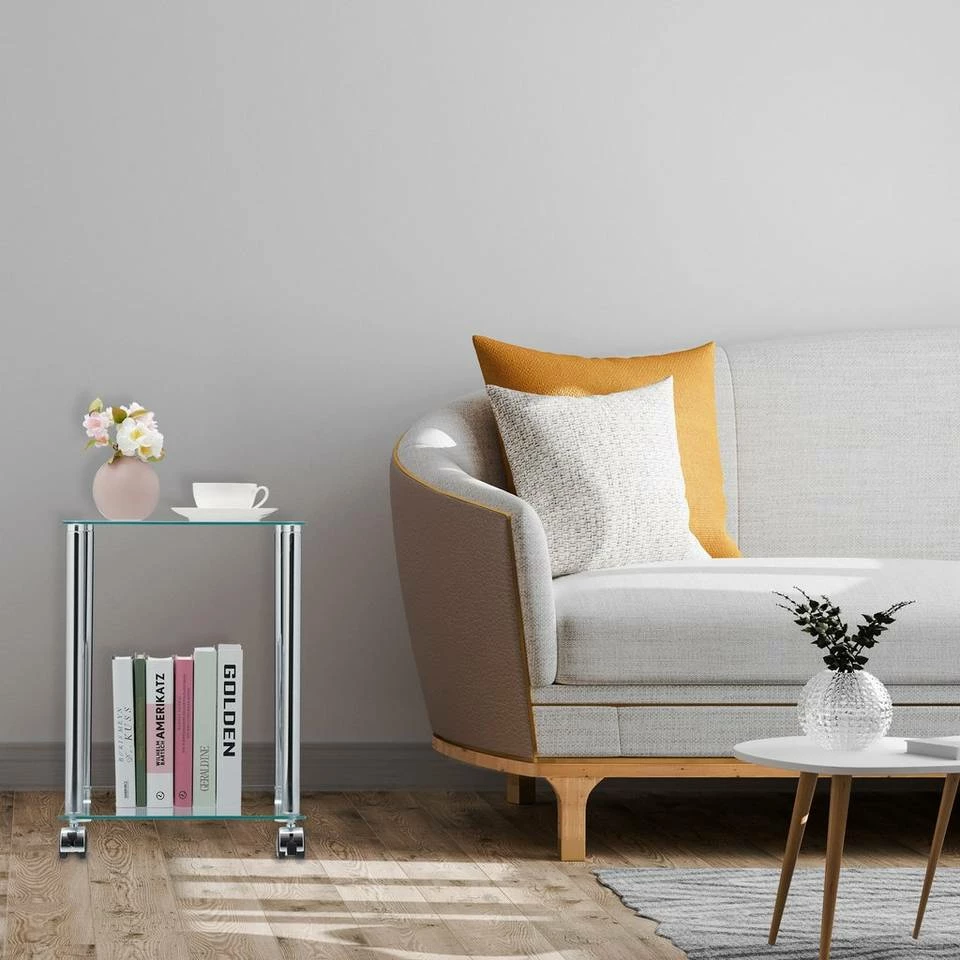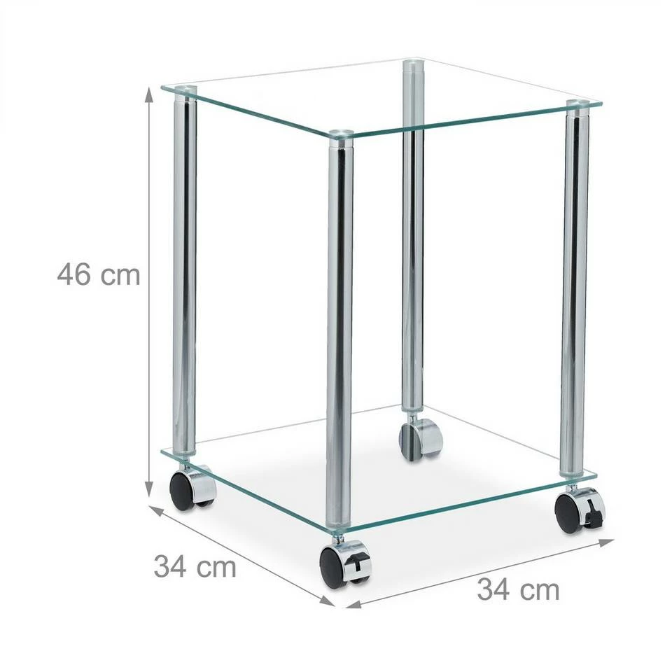 Rollbarer Sofatisch aus Glas Der viereckige Couchtisch ist die ideale Ablage für Snacks und Getränke beim abendlichen Entspannen auf dem Sofa. Auf den 2 Ebenen haben Sie Bücher und Zeitschriften immer in Reichweite oder können Blumen und Deko attraktiv arrangieren. Durch die Rollen ist der Nebentisch mobil und kann immer dahin geschoben werden, wo er gerade benötigt wird. Das zeitlose Design aus Glas und glänzendem Metall macht den Tisch in jedem Raum zum Hingucker.