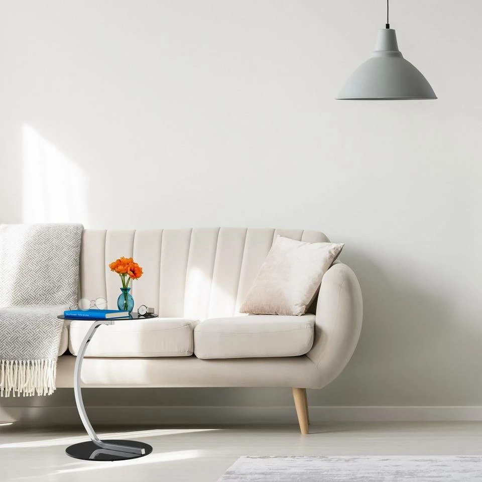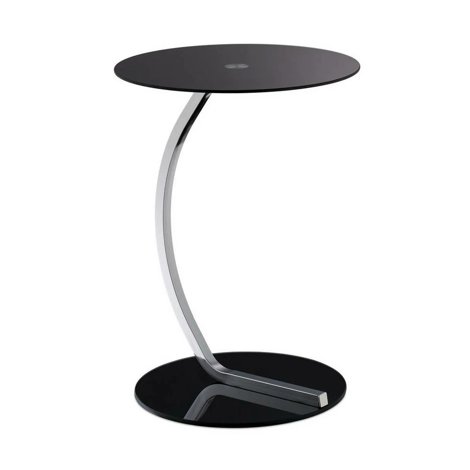 Kleiner Sofatisch mit runder Glasplatte Für verschiedenste Räume in Ihrem Zuhause ist dieser moderne Beistelltisch perfekt geeignet! Ob als runder Couchtisch im Wohnzimmer zum Abstellen von Getränken und Snacks, im Flur als Ablagetisch für Schlüssel und mehr oder im Arbeitszimmer als Telefontisch – überall macht der schwarze Glastisch eine gute Figur. Besonders das ausgefallene Design mit dem verchromten Standfuß ist ein wahrer Hingucker in Ihrer Wohnung.