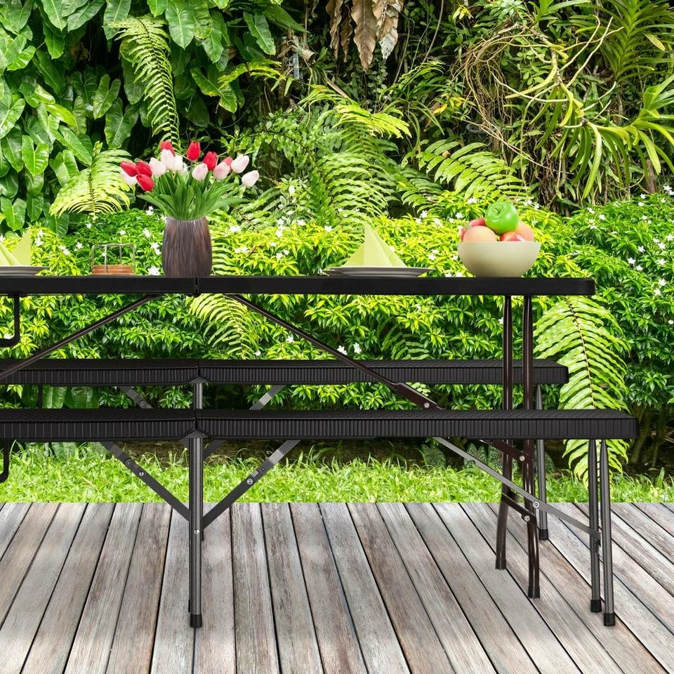 Faltbare Partybank im Set für Bierzelt, Pavillon & Co. Bei Grillfesten, auf dem Campingplatz oder beim Zusammensitzen auf der Terrasse ist eine flexible Sitzgelegenheit von besonderem Vorteil. Mit dieser Faltbank im Set sind Sie dafür bestens ausgestattet. Die Heurigen Bank ist sowohl im Handumdrehen aufgebaut als auch schnell zusammengeklappt. Somit lässt sie sich platzsparend verstauen oder einfach mit dem Tragegriff transportieren. Die schwarze Festzeltbank aus robustem Kunststoff macht dabei dank moderner Rattan-Optik überall eine gute Figur.
