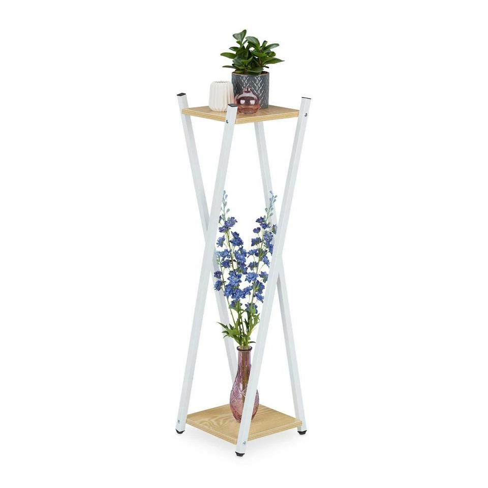 Dekorativer Topfpflanzenständer Mit diesem Pflanztisch setzen Sie Ihre Blumen und Pflanzen perfekt in Szene. Egal ob bunte Orchidee, schlichtes Einblatt oder exotische Palme – mit der Dekosäule wird jedes Pflänzchen zum garantierten Hingucker. Die Holzoptik der Ablagen harmoniert perfekt mit dem weißen Metallgestell, dessen X-Design der Blumenetagere einen ganz besonderen Look verleiht. Platzieren Sie den Pflanzenhocker in Wohnzimmer, Flur oder Wintergarten und verleihen Sie Ihrer Wohnung das gewisse Etwas.