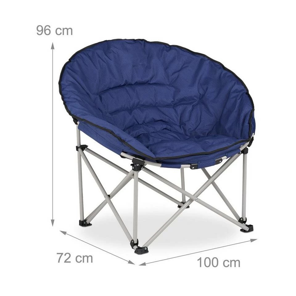 Faltbarer Campingstuhl zum Relaxen im Freien Dieser Campingsessel ist ideal für alle Fans von Outdoor-Ausflügen, die nicht auf Komfort verzichten wollen. Die gepolsterte XXL Sitzfläche & große Rückenlehne laden zum ausgiebigen Relaxen ein. Ob im Garten, auf Balkon oder Terrasse, mit dem Mondstuhl lässt sich die warme Sonne wunderbar genießen. Er ist im Handumdrehen zusammengefaltet & in der Tragetasche zum Transport verstaut. Somit kann der blaue Klappstuhl auch am Lagerfeuer beim Camping, auf Angelausflügen oder beim Festival überzeugen.