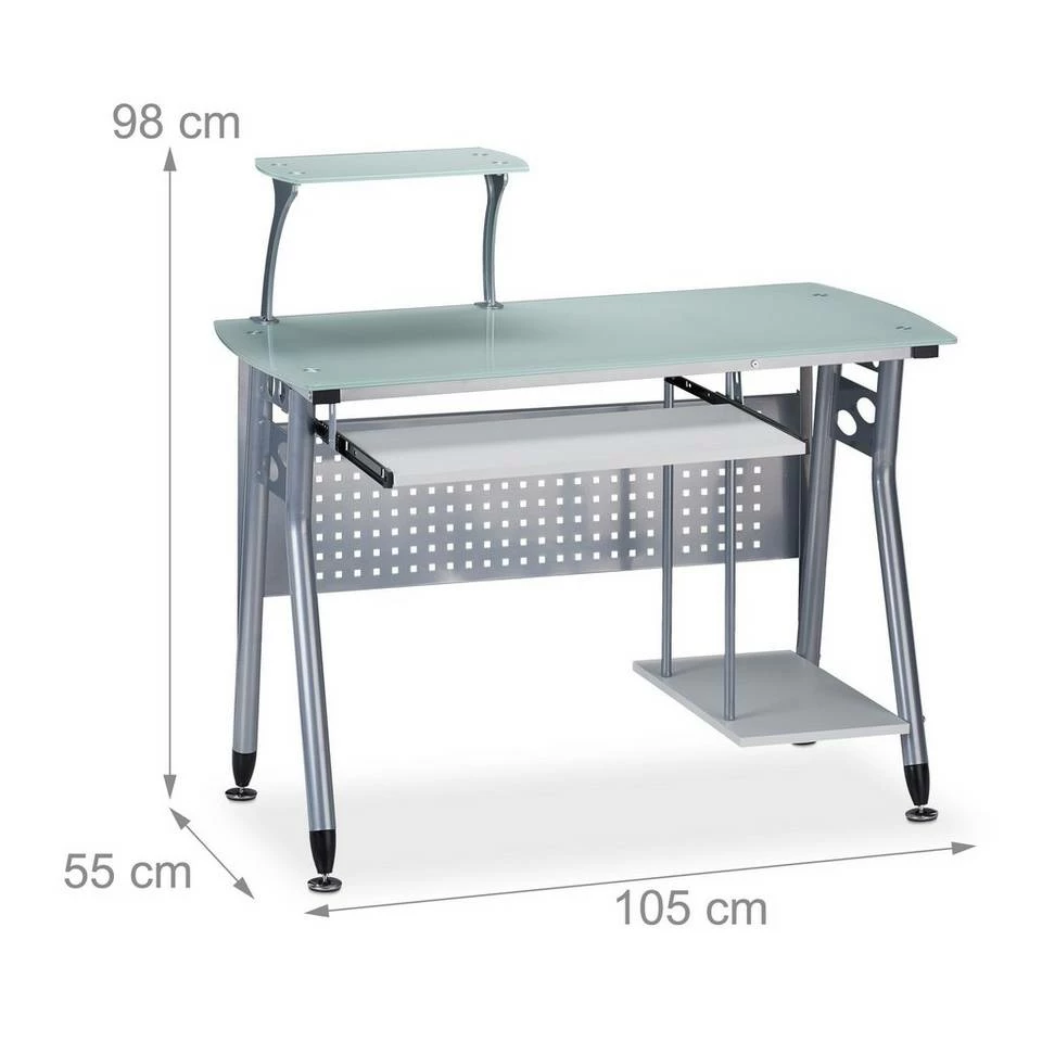 - Details: Platzsparender Schreibtisch – HxBxT: ca. 98 x 105 x 55 cm – Arbeitsfläche aus gehärtetem Glas