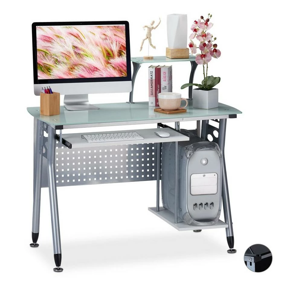 Moderner Glas-Schreibtisch mit Tastaturablage Mit dem praktischen wie dekorativen Bürotisch macht Arbeiten gleich viel mehr Spaß. Auf dem modernen PC Tisch bringen Sie platzsparend alle Arbeitsgeräte unter. Für die Tastatur gibt es eine ausziehbare Schublade. Somit bleibt die große Arbeitsfläche aus gehärtetem Glas stets frei für weitere Arbeitsutensilien. Den Rechner stellen Sie in das Fach, wo er sicher verstaut ist. Zudem wartet der Computerschreibtisch mit einer beweglichen Ablage für Deko auf, die nach Belieben versetzt werden kann.