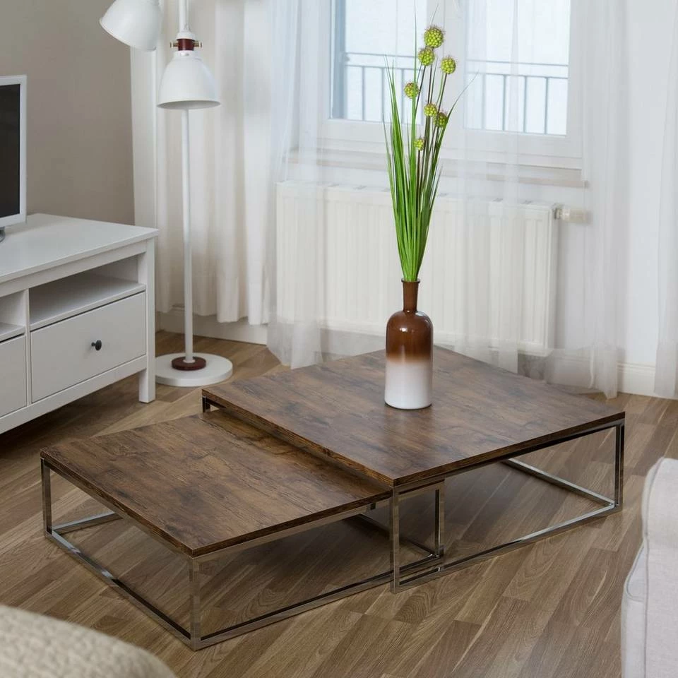 Couchtisch FLAT im Set Stellen Sie Getränke, Snacks oder Zeitschriften bequem im Wohnzimmer ab. Die FLAT Couchtische verdanken Ihren Namen der stylischen, niedrigen Höhe. Dank ihr wirkt die große Ablagefläche sehr leicht und der Raum optisch größer. Sie gelangen auch liegend im Sofa oder Sessel bequem an die Tischplatte. Das Set kommt mit 2 Tischen, die ineinander verschiebbar sind. Damit bieten sich Ihnen dekorative und platzsparende Stellmöglichkeiten. Zusammen mit dem modernen Mix aus Holz und Metall wird werden die Couchtische zum Blickfang in Ihrer Einrichtung.