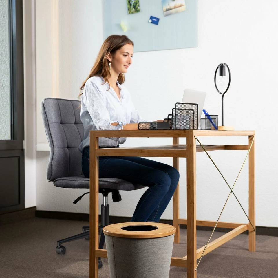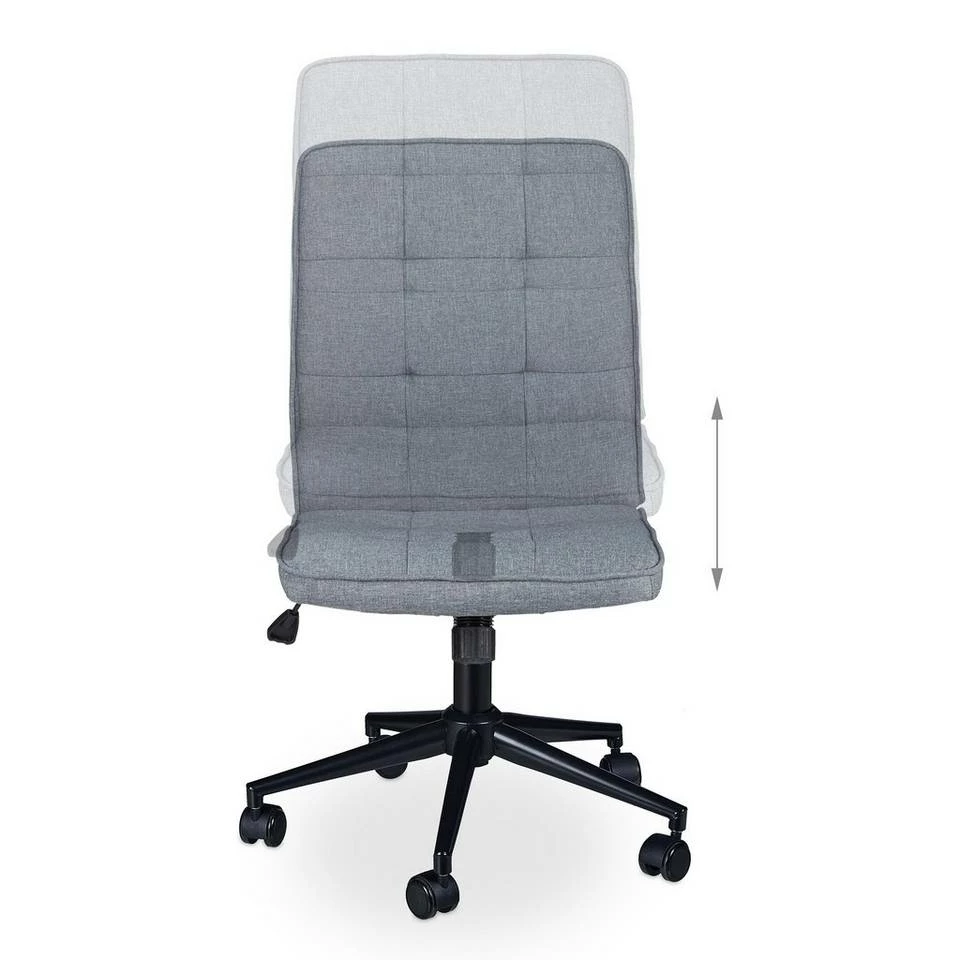 Ergonomischer Schreibtischstuhl Beugen Sie Rücken- und Nackenschmerzen bei langem Sitzen am Schreibtisch mit diesem ergonomischen Drehstuhl vor. Die Rückenlehne passt sich dank Lordosenstütze natürlich an Ihre Haltung an. Die gepolsterte Sitzfläche ist auch bei langem Sitzen am Schreibtisch im Büro oder Arbeitszimmer noch bequem. Verstellen Sie die Höhe des Arbeitssessels ganz einfach stufenlos durch den seitlichen Hebel. Das moderne Design aus Stoff und Metall ist zudem auch optisch ein Blickfang.