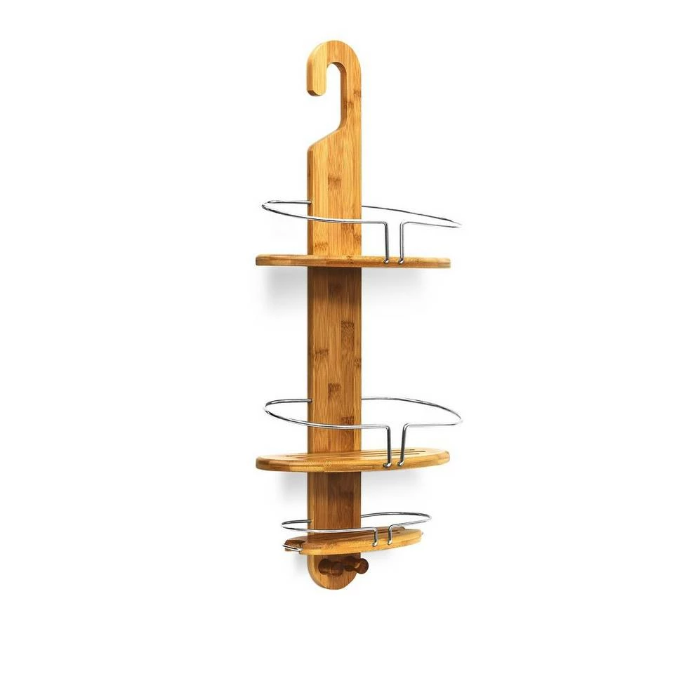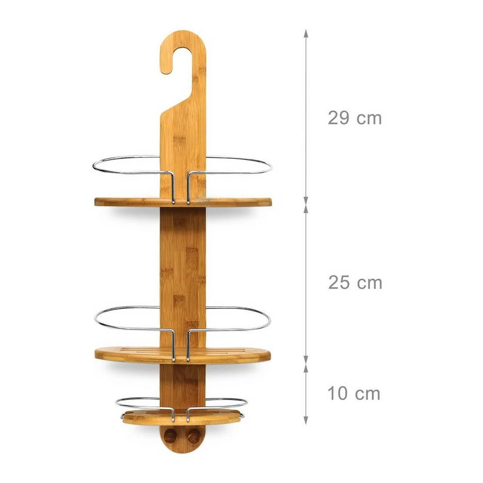 Hängeablage für die Dusche Egal ob in der Dusche für Shampoo und Duschgel oder außerhalb der Dusche für Lotions und Handtücher – diese Hängeablage schafft Platz in ihrem Badezimmer! Das Duschregal mit 3 großen Ablageflächen besteht aus feuchtigkeitsresistentem Bambus. Die 3 Ablageböden verfügen über jeweils 3 Rillen, sodass sich in den Fächern kein Wasser anstauen kann. Das natürliche Bambus wird durch praktische Streben aus verchromtem Metall ergänzt, die auch größeren Flaschen und Tuben Halt geben. Weiterer Duschzubehör wie Schwämme, Lappen oder Bürsten können einfach an den 2 Haken an der Unterseite des Regals aufgehängt werden.