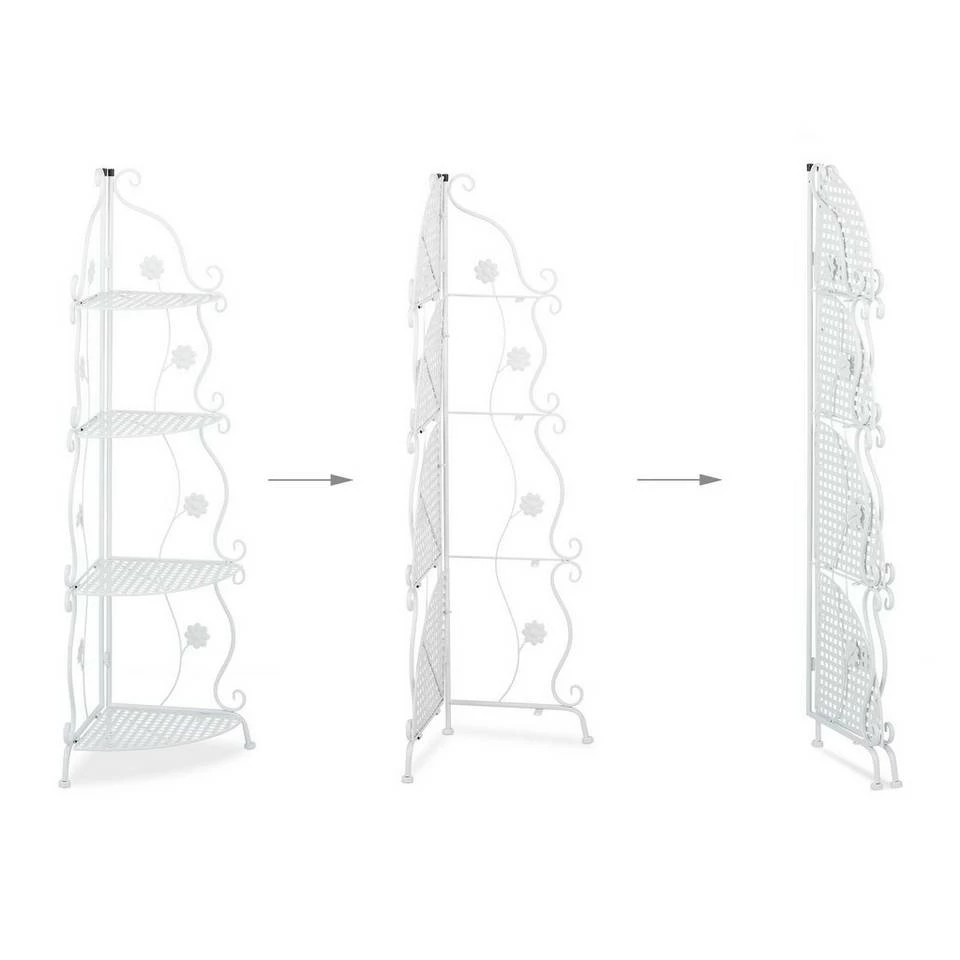 Dekoratives Eckregal mit Metallgestell Das Pflanzenregal schafft endlich den nötigen Platz, um geliebte Blumen dekorativ zu präsentieren. Bunte Blüten, Kräuter, Blumentöpfe, Deko und Vasen lassen sich auf den 4 Ablagen optisch schön anrichten. Gestalte Deine persönliche kleine Pflanzenecke im Wohnzimmer oder Wintergarten oder stelle das Eckregal geschützt im Garten, auf dem Balkon und der Terrasse auf. Dank ansprechendem Vintage Design mit dekorativen Blumenranken, wirkt das vielseitig einsetzbare Metallregal in jedem Raum.