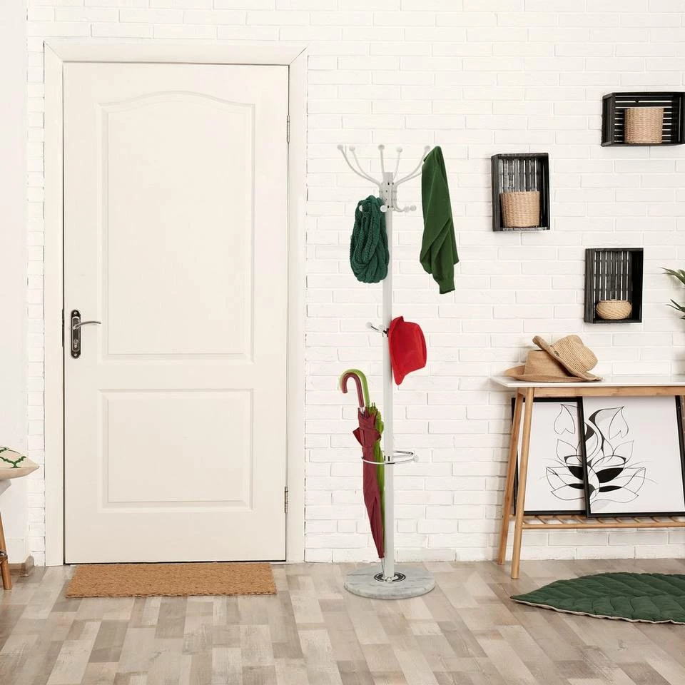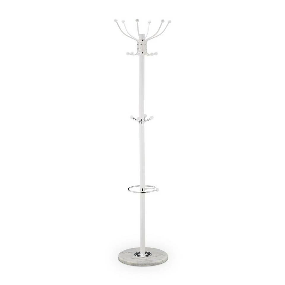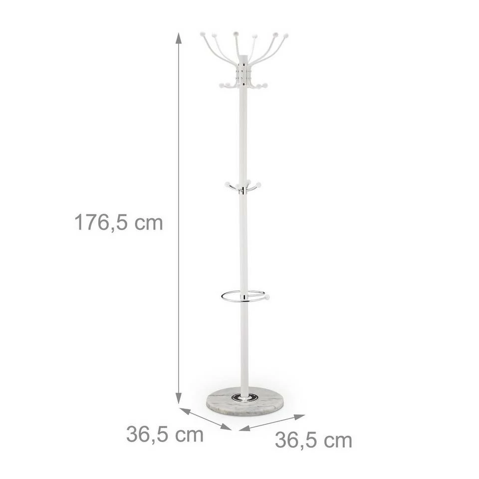 - Design: Schicker Jackenständer mit Marmorfuß in schlichtem Weiß – Mit praktischem Schirmständer
