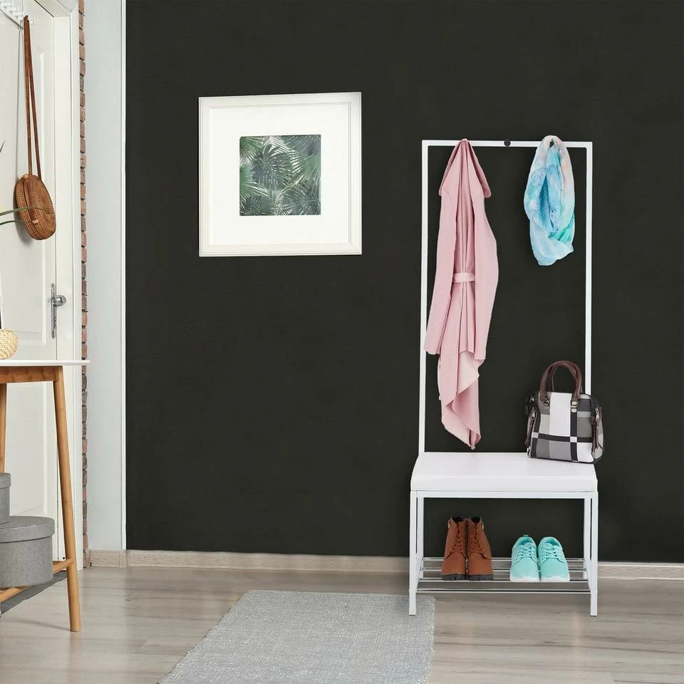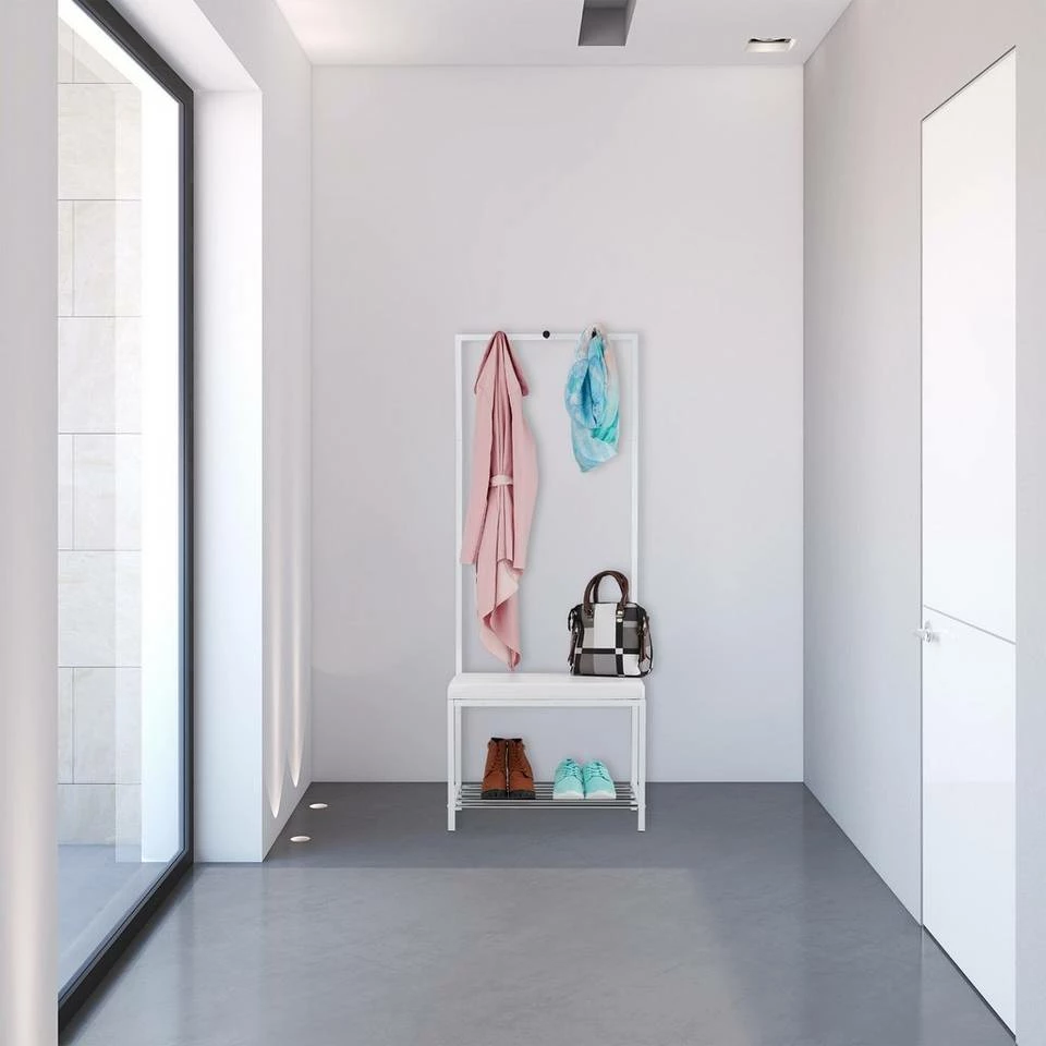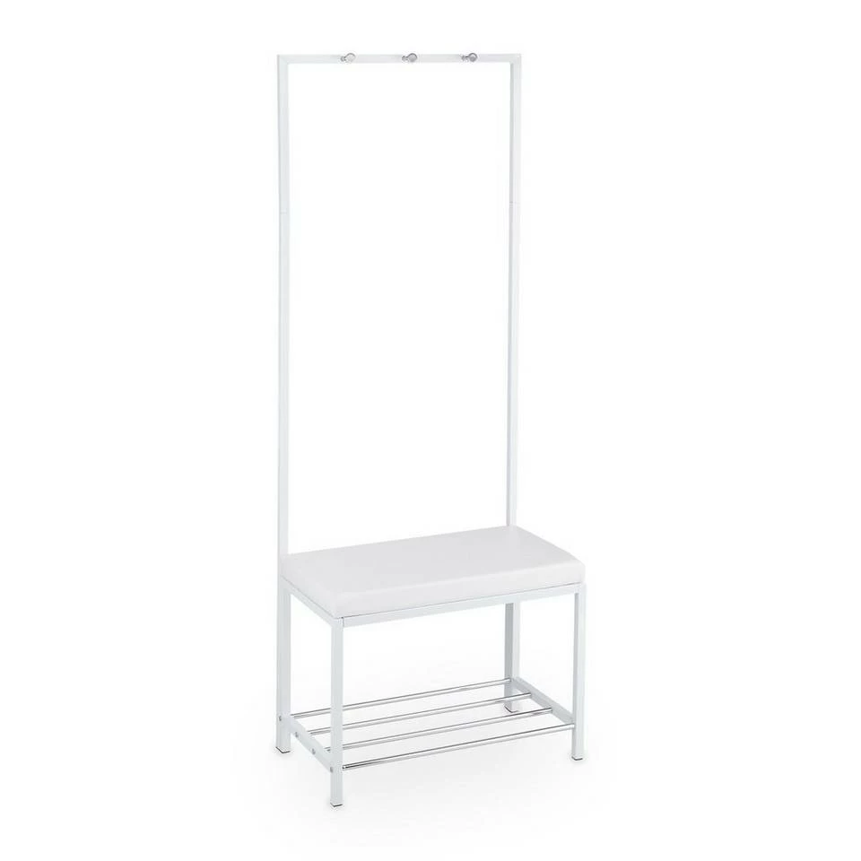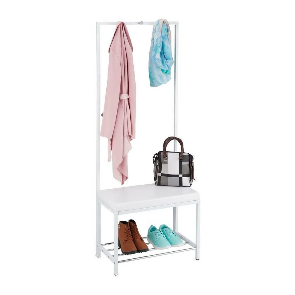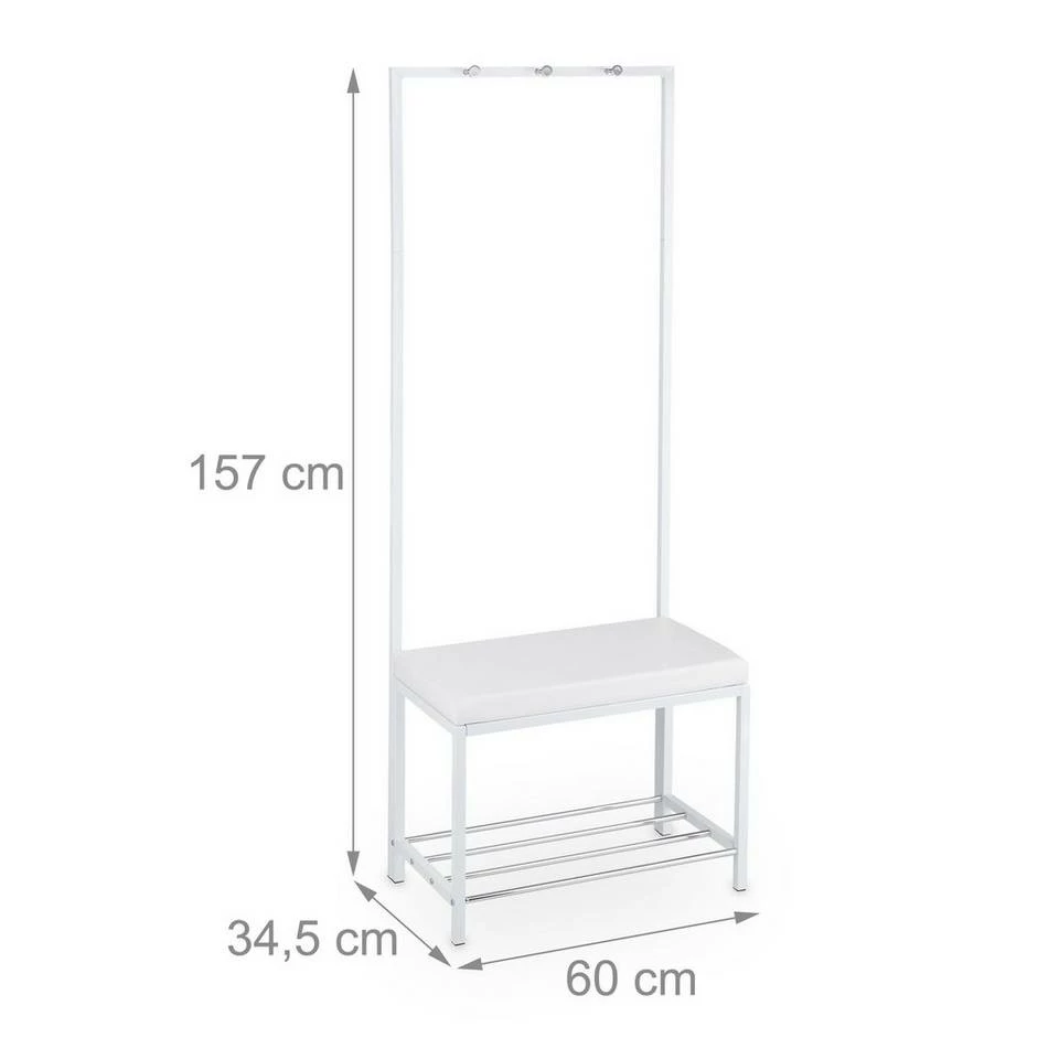 Weißer Kleiderständer mit Schuhbank Sorgen Sie für einen ordentlichen Eingangsbereich im Clean Chic mit dieser modernen Kleiderablage. Die weiße Standgarderobe verfügt über 3 Haken sowie eine Ablage. Somit haben Sie ausreichend Platz, um Jacken, Taschen, Schals, Schuhe sowie Aufbewahrungsboxen unterzubringen. Zudem lässt es sich gemütlich auf der Sitzbank der freistehenden Garderobe Platz nehmen während des Schuhe An- oder Ausziehens. Mit ihrem schlicht-eleganten Look in Weiß und den silbernen Details überzeugt die Kleidergarderobe nicht nur in Flur und Diele, sondern ebenso als Umkleidebank im Schlafzimmer.