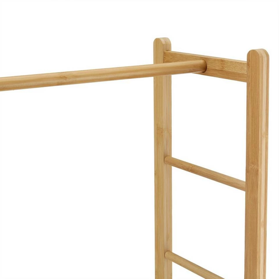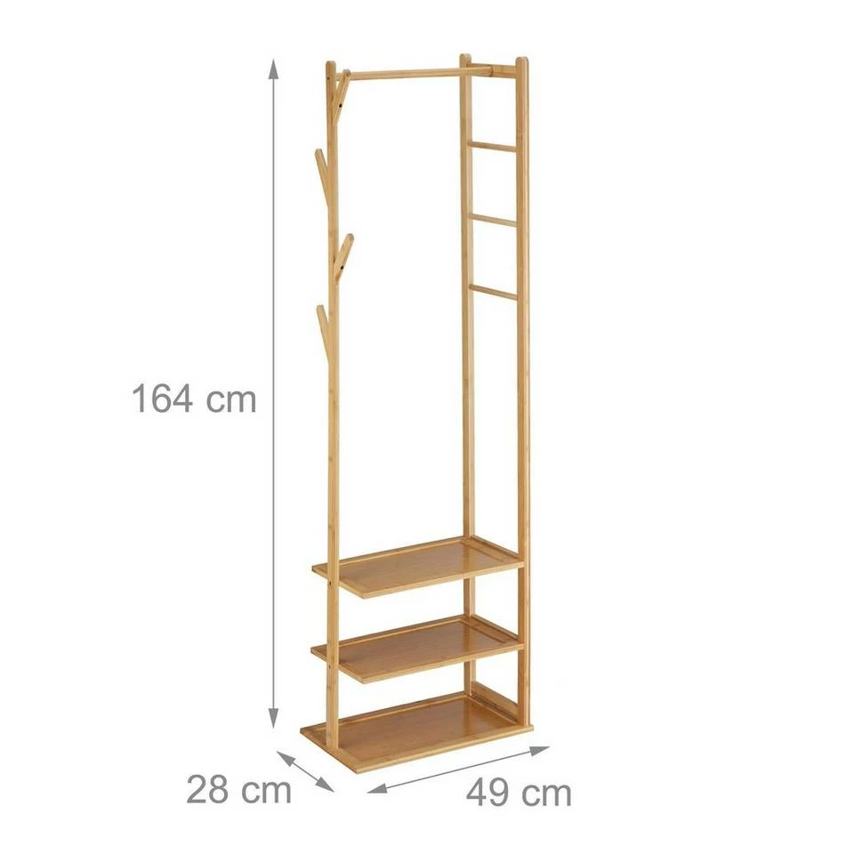 Bambus Garderobe für Wohn- & Schlafbereich Dieser moderne Kleiderständer bietet Dir jede Menge Stauraum im Flur oder Schlafzimmer und überzeugt mit seinem funktionalen Design. Hänge Deine Hemden, Blusen und andere Kleidungsstücke übersichtlich an der Garderobenstange auf. Bis zu 6 Paar Schuhe und Taschen stellst Du auf den Ablagen ab, Jacken und Mäntel finden an den 4 Kleiderhaken einen Platz. Dank des schlichten Looks aus Bambus fügt sich das Kleidergestell in jeden Einrichtungsstil perfekt ein und setzt natürliche Akzente.