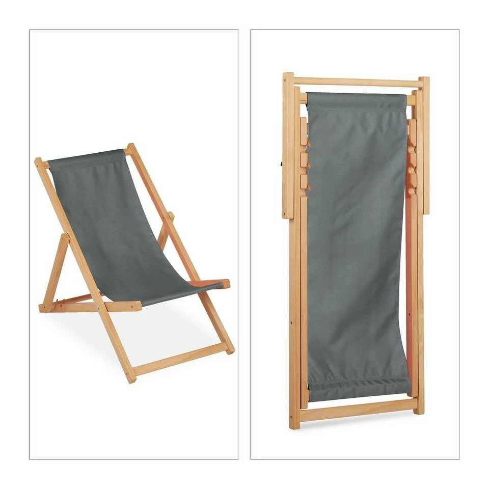 Grauer Stoff Liegestuhl mit Holzgestell Was gibt es Schöneres, als bei gutem Wetter die Sonne zu genießen? Mit diesem komfortablen Liegestuhl können Sie es sich so richtig gemütlich machen – egal ob auf dem Balkon, im Garten oder auch am Badesee oder im Park. Bei 3 einstellbaren Sitzpositionen ist für jeden etwas dabei. Wollen Sie den Sonnenstuhl transportieren oder verstauen, lässt er sich einfach und platzsparend zusammenklappen. Dank dem Gestell aus robustem Buchenholz sieht der Klappstuhl nicht nur gut aus, sondern ist auch stabil und belastbar.