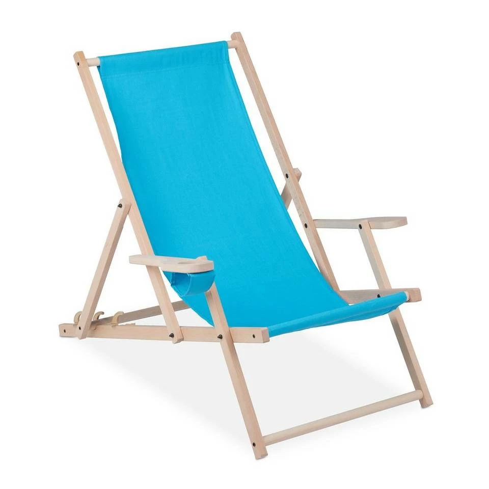 Schöner, klappbarer Sonnenliegestuhl Um es sich auf dem Balkon, der Terrasse oder im Garten gemütlich zu machen, fehlt Ihnen nur noch die passende Sonnenliege. Dieser Holzliegestuhl besitzt 3 verschiedene Liegepositionen, sodass Sie sich rundum entspannen können. Für noch mehr Komfort hat die Klappliege einen Getränkehalter und breite Armlehnen. Bei Bedarf kann die Stoffliege zusammengeklappt und platzsparend verstaut werden. Der Aufbau der Balkonliege ist dank Anleitung schnell erledigt.