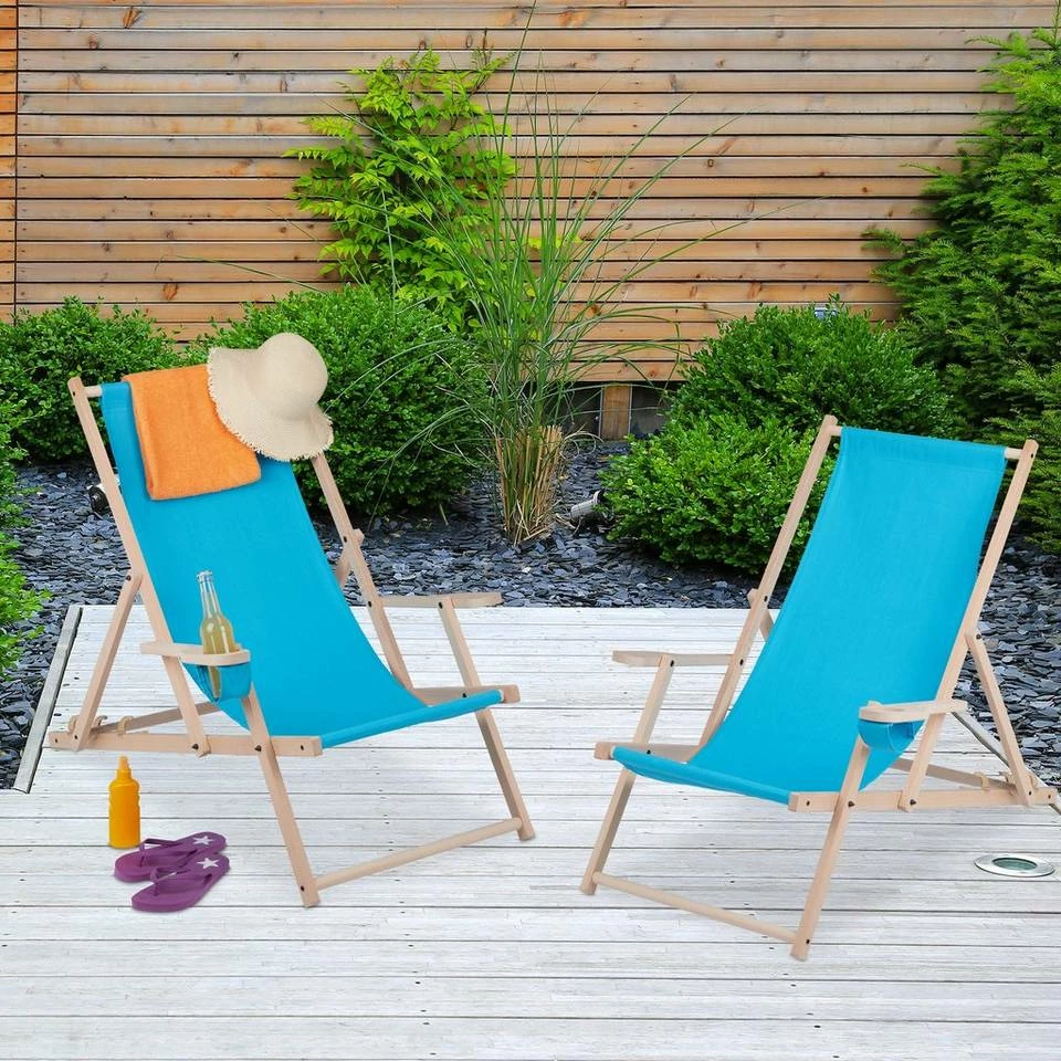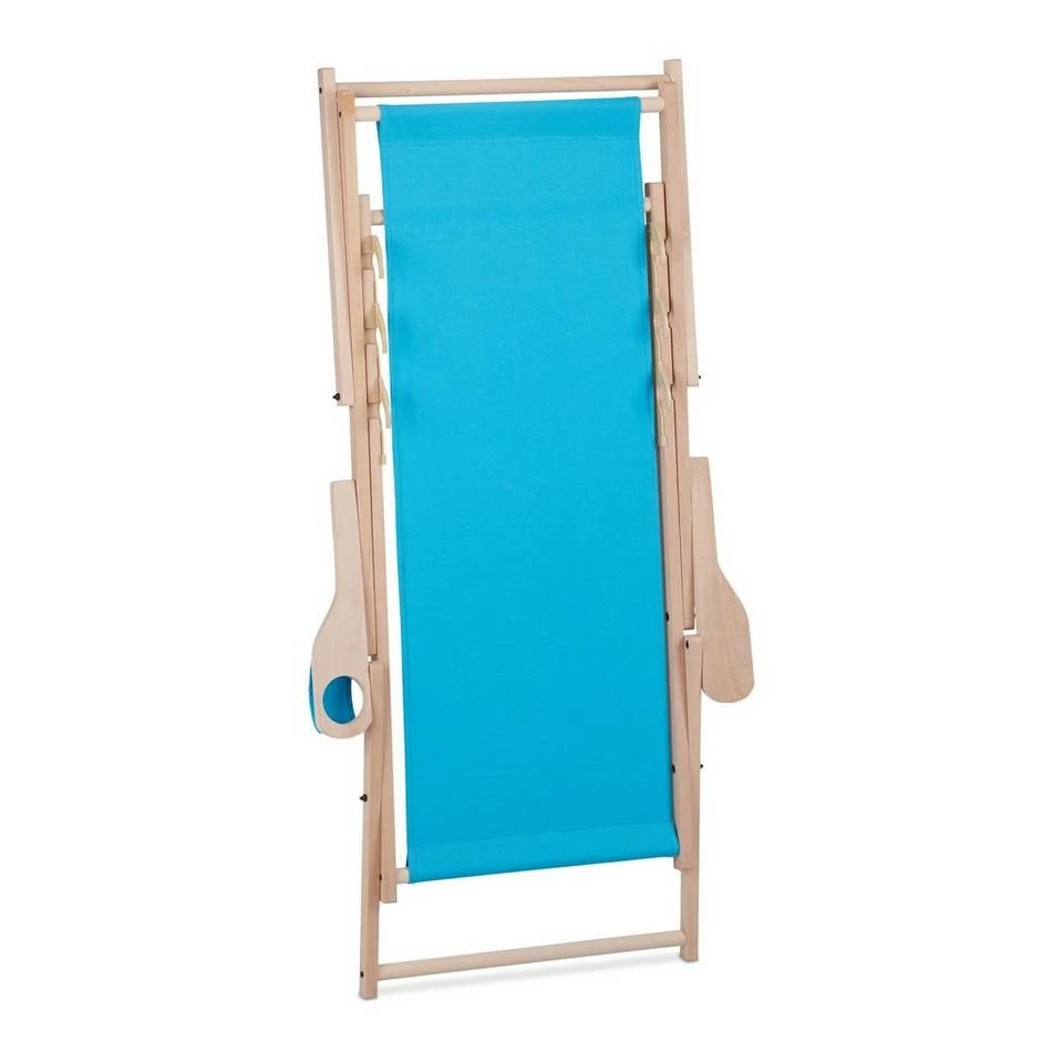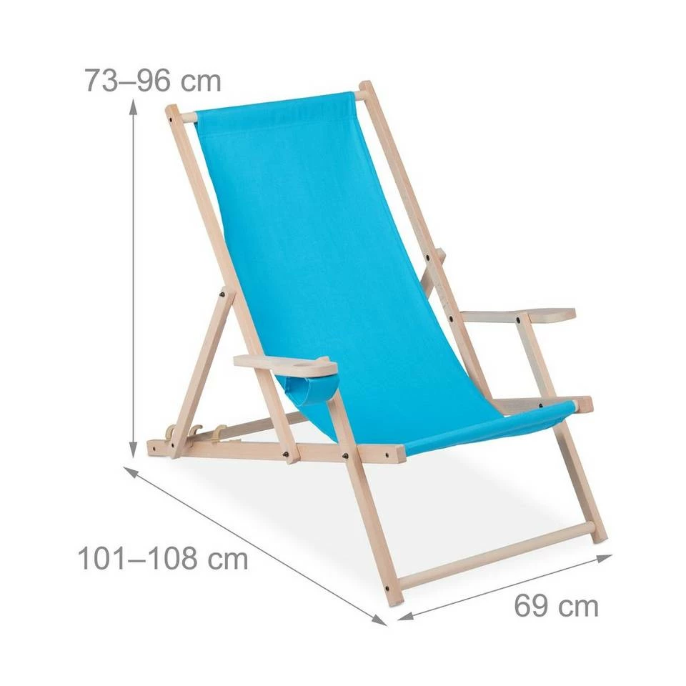 - Details: Liegestuhl aus Buchenholz mit Stoffbezug – Mit Armlehnen und Getränkehalter – Bis 120 kg