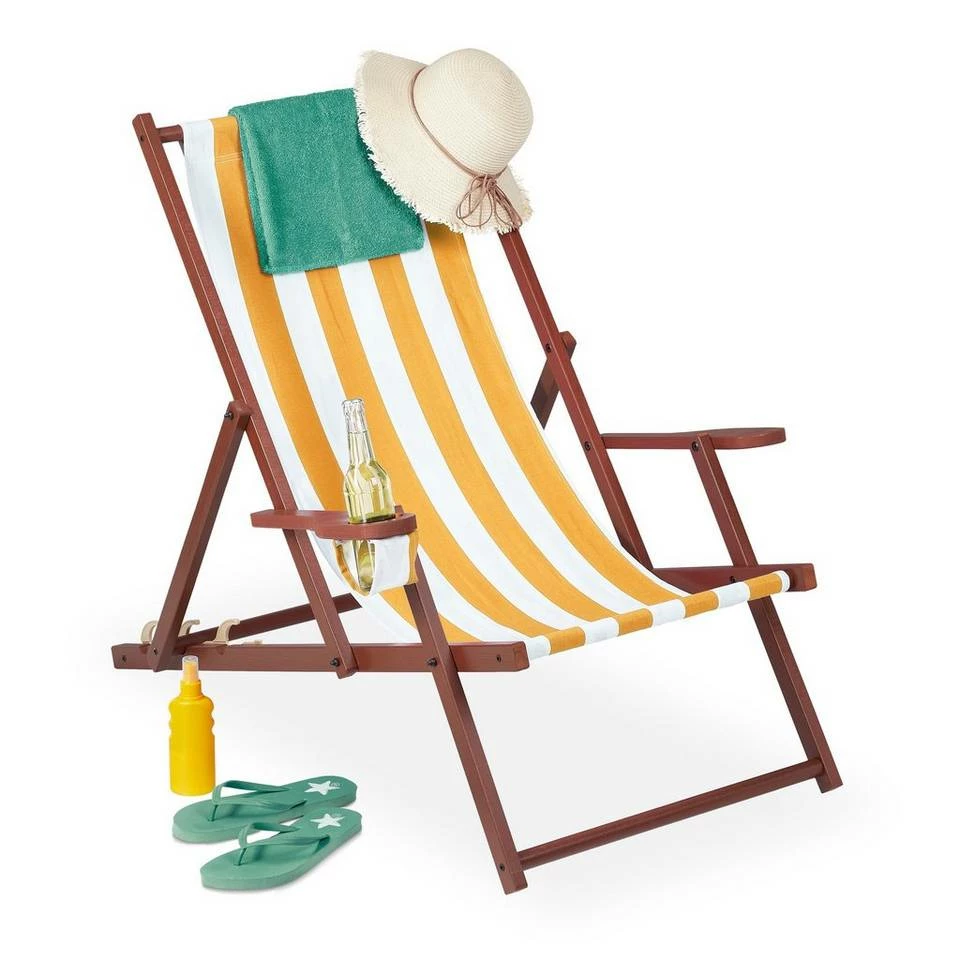 - Details: Liegestuhl aus Buchenholz mit Stoffbezug – Mit Armlehnen und Getränkehalter – Bis 120 kg