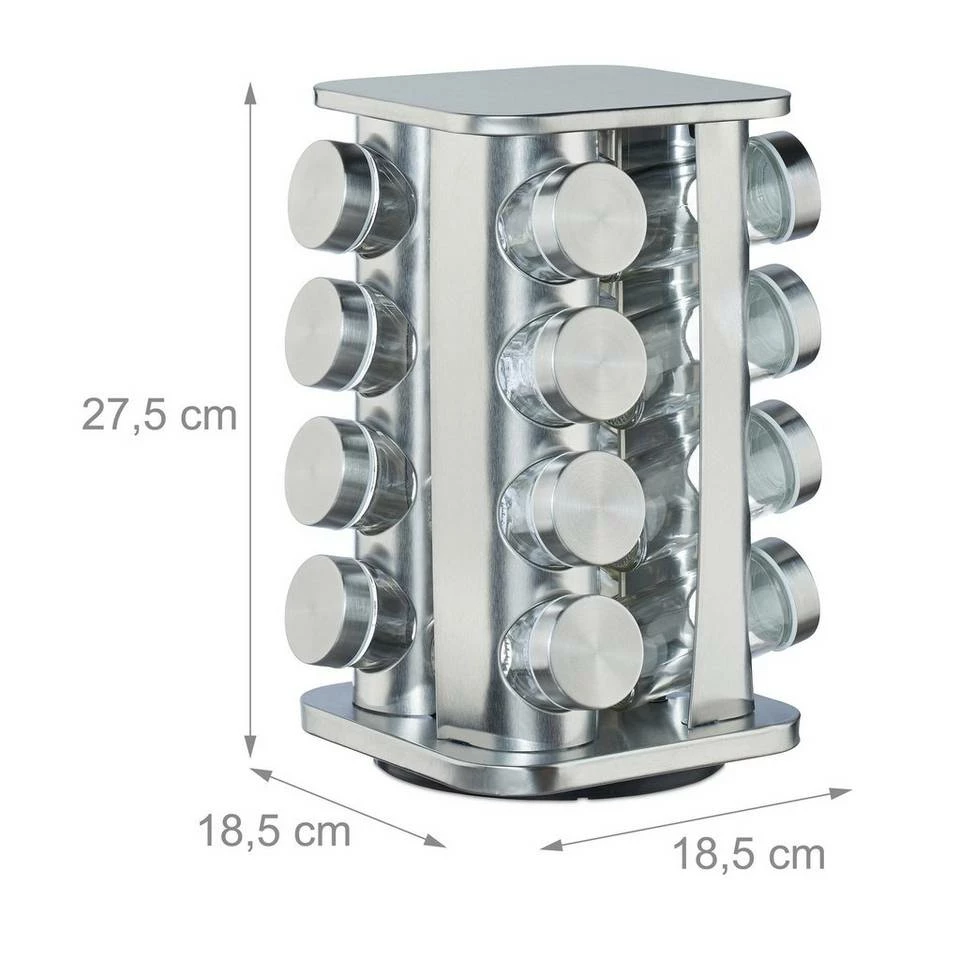 Gewürzglas Halter mit 4 Etagen Köstliche Gewürze verleihen vielen Gerichten erst ihren besonderen Charme. Das moderne Gewürzkarussell aus mattem Edelstahl sorgt dafür, dass Ihnen die Zubereitung dieser kulinarischen Wohltaten leicht und locker von der Hand geht. Dank der Scheibe auf der Unterseite lässt sich das Gewürzregal vollständig drehen. Die 16 Gewürzgläser ermöglichen nicht nur den schnellen Überblick über Pfeffer, Zimt und Co., sondern eignen sich aufgrund ihrer Einsätze auch zum Streuen.