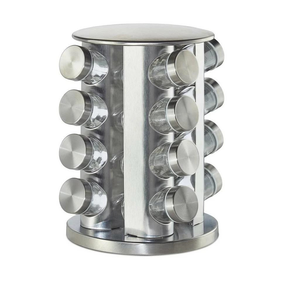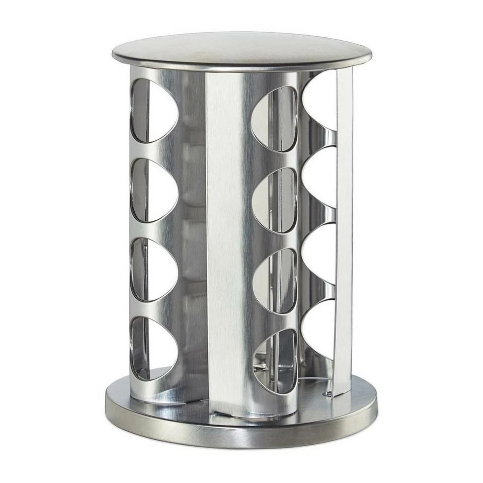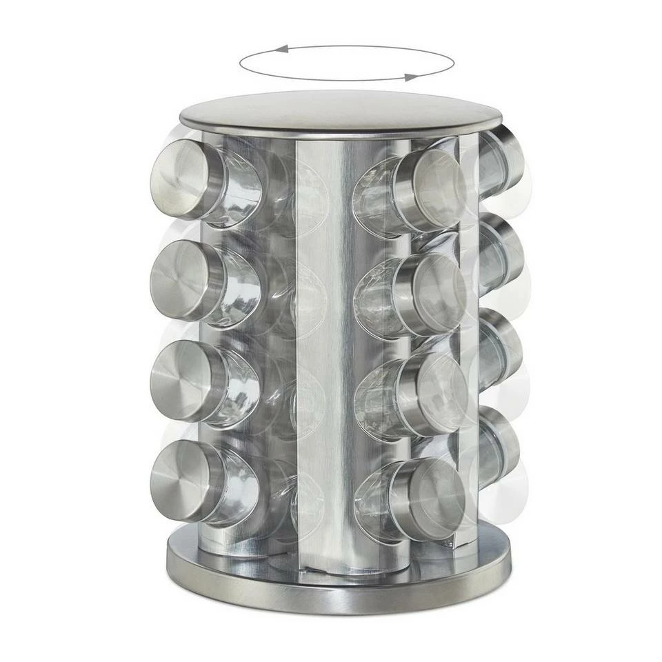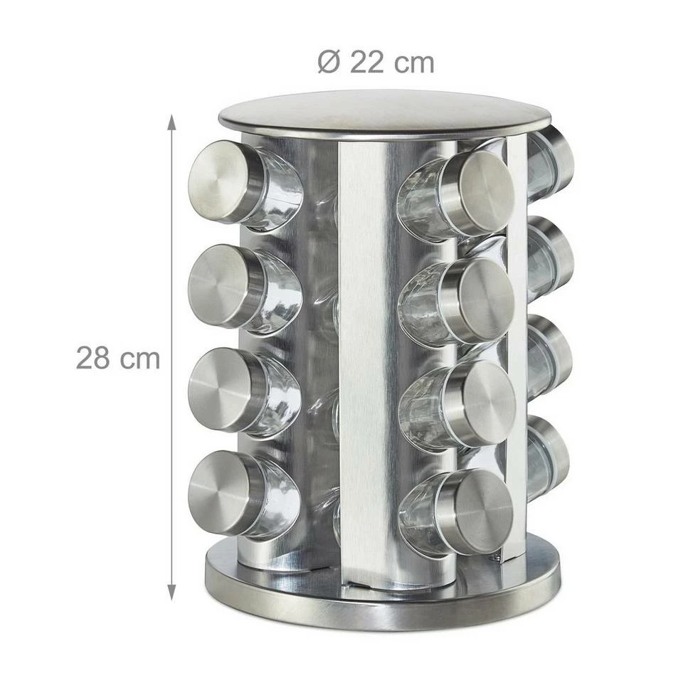 Drehbarer Gewürzständer aus Edelstahl Mit Gewürzen verleihen Sie vielen Gerichten den letzten Schliff. Um Ihre Gewürzsammlung ordentlich und übersichtlich aufzubewahren, eignet sich dieses praktische Gewürzrondell mit Drehfunktion. Auf wenig Standfläche bietet das Gewürzregal Platz für 16 verschiedene Gewürze und Kräuter. Dank der Streueinsätze können die Gläser auch direkt als Gewürzstreuer am Esstisch verwendet werden. Zudem schützen die Schraubdeckel aus Edelstahl den Inhalt der Gewürzgläser vor Feuchtigkeit.