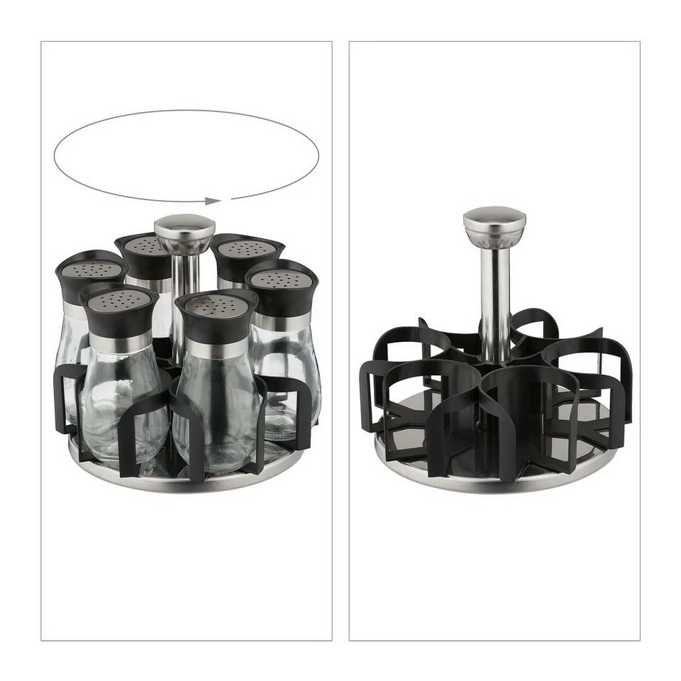 Drehbarer Gewürzständer Dieses stillvolle Gewürzkarussell eignet sich ideal zur Aufbewahrung von Kräutern und Gewürzen. Die komplette Drehbarkeit des Gewürzregals sorgt dafür, dass Ihnen Gewürzbehälter stets griffbereit und übersichtlich zur Verfügung stehen. Das Gewürzdrehregal ist mittig mit einem praktischen Edelstahlknauf versehen, der das Drehen und Tragen erleichtert. Dabei fungieren die bauchigen Gläser dank ihres Streueinsatzes auch als Gewürzstreuer. Der rotierende Gewürzorganizer aus mattem Edelstahl und schwarzem Kunststoff ist eine praktische Ergänzung für jede Küche.