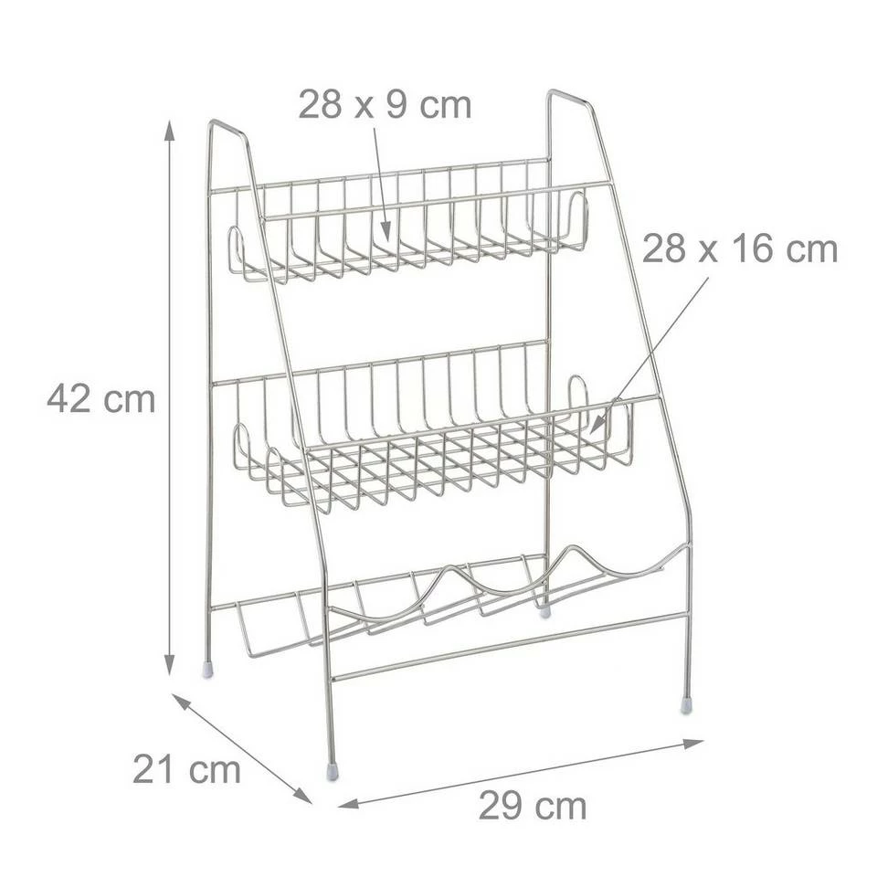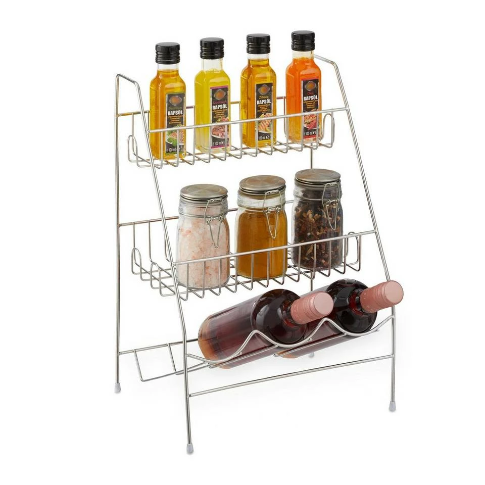 Gewürzhalter freistehend Das praktische Gewürzregal hält auf Ihrer Küchenzeile für Sie Gewürze, Tee und nötige Zutaten bereit, wann immer Sie diese benötigen. Auf der Arbeitsplatte oder im Küchenregal – auf 3 Ebenen wird der vorhandene Platz optimal genutzt und eine gute Übersicht garantiert. Besonders praktisch ist der Flaschenhalter: Bis zu 3 Flaschen können auf der unteren Ebene gelagert werden, damit Sie Öl, Essig und weiteres immer griffbereit haben. Dank des schlichten Designs passt das Kräuterregal in jede Küche.