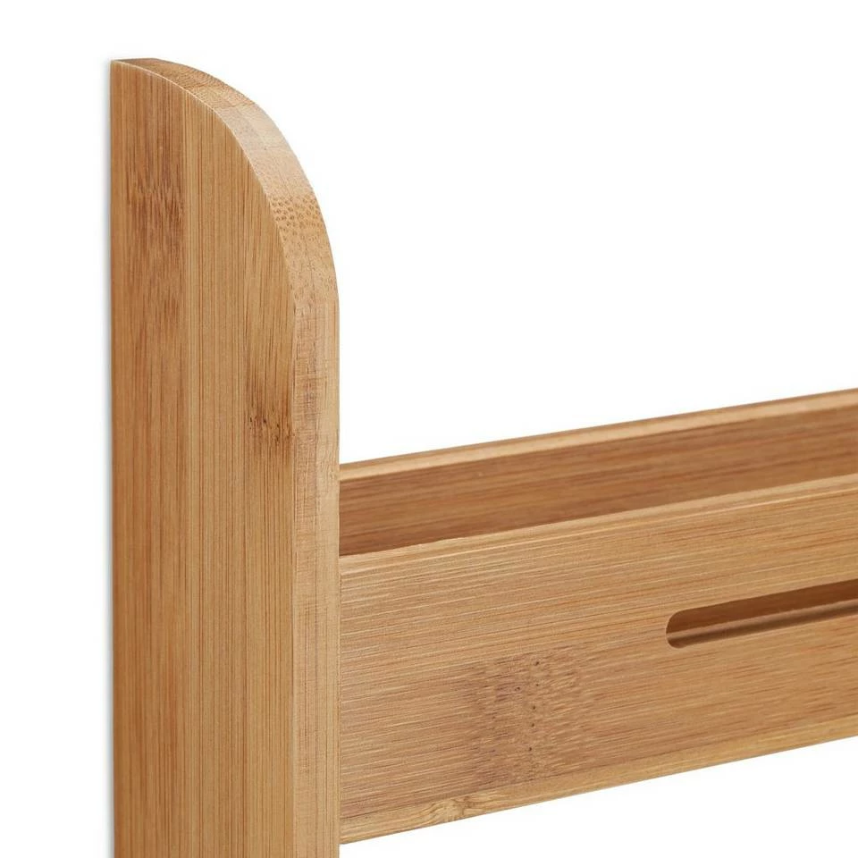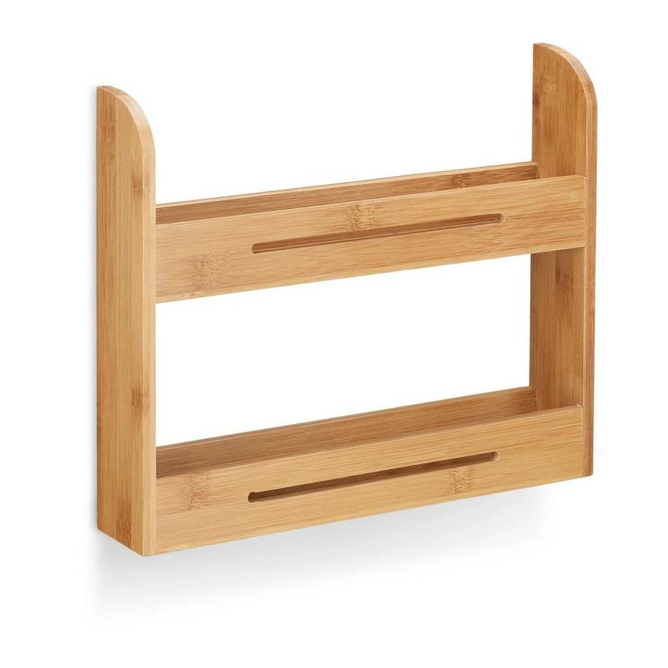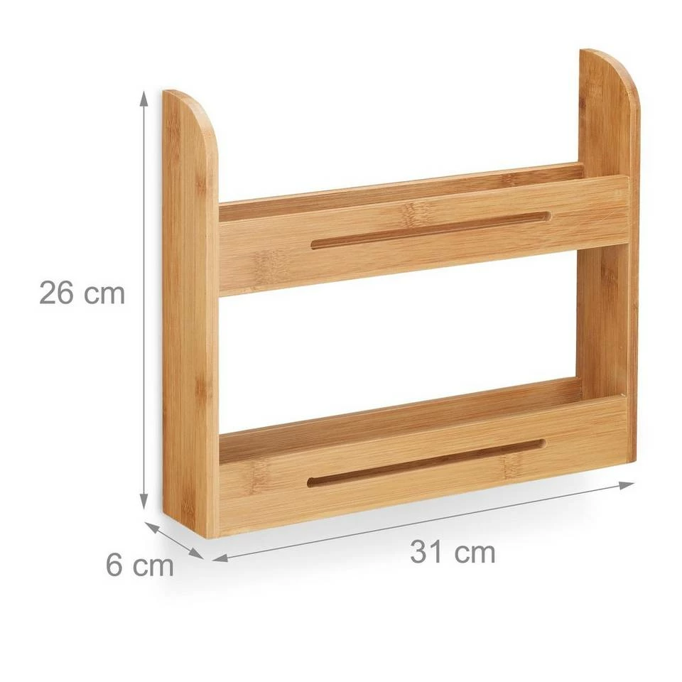Gewürzregal aus Bambus Um in Ihrer Küche gut gewürzte Geschmackskreationen zu zaubern, ist dieses Kräuterregal aus Bambus der ideale Mitstreiter. Der natürliche Rohstoff überzeugt mit Nachhaltigkeit und lässt sich problemlos mit einem feuchten Tuch reinigen. Dank der 2 Ebenen lagern Sie mehrere Streuer sehr platzsparend. Die naturbelassene Maserung macht das Gewürzregal auch zu einem optischen Leckerbissen. Das gilt besonders dann, wenn das kleine Küchenregal an einer Wand steht.