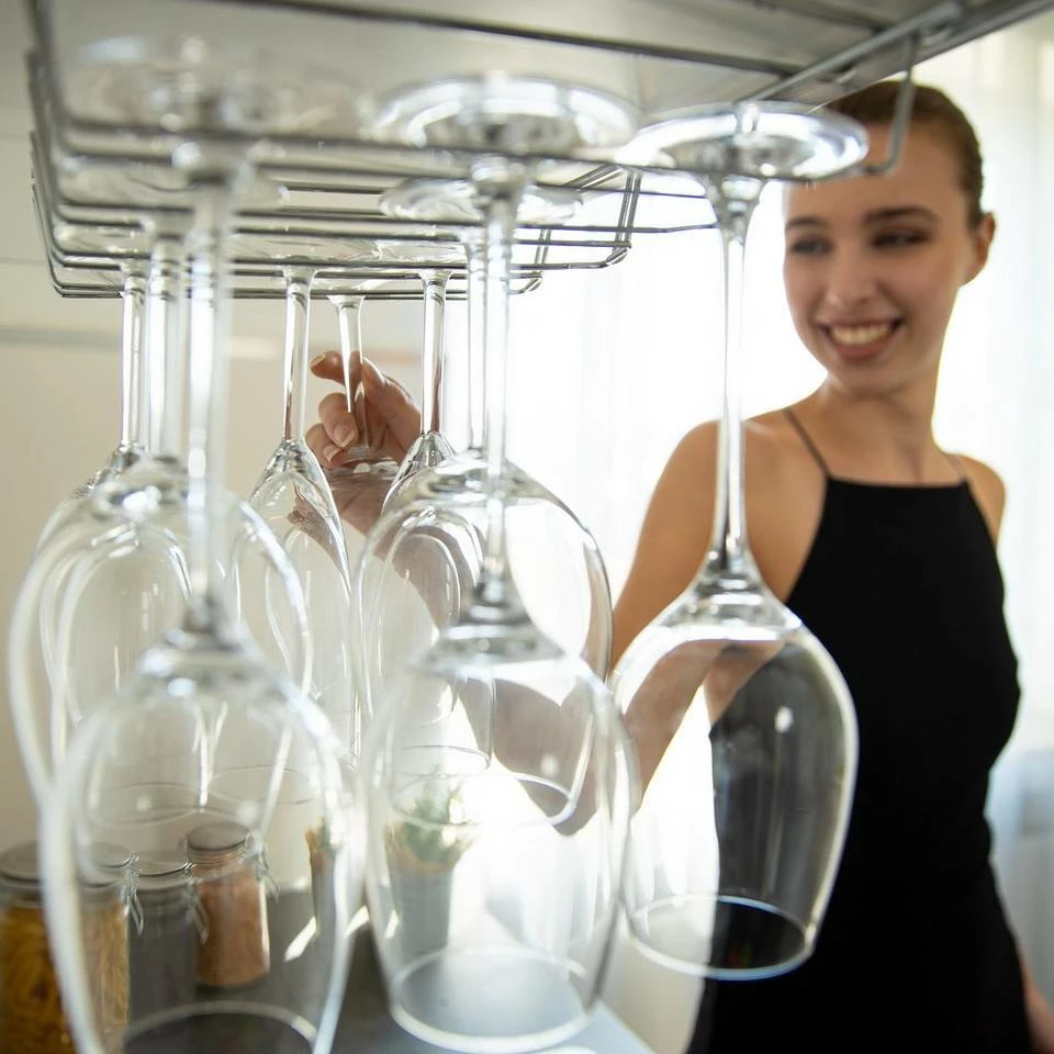 Gläserhalter zum Aufhängen im Schrank Da sich Stielgläser nicht stapeln lassen, nehmen sie oft viel Platz im Schrank in Anspruch, der dann für andere Küchenutensilien fehlt. Hängen Sie Ihre Wein-, Bier- und Sektgläser daher in Zukunft mit der Gläserhalterung kopfüber im Küchenschrank auf und schaffen Sie so zusätzlichen Stauraum. Dafür muss die Weinglasaufhängung aus Metall lediglich am Schrank- oder Regalbrett eingehängt werden und schon können Sie die 4 nebeneinander angeordneten Gläserschienen mit Ihren Stielgläsern bestücken.