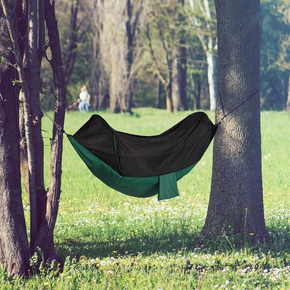 Hängematte mit Moskitonetz Genießen Sie einen erholsamen Schlaf in dieser bequemen Baumhängematte, egal ob im Garten oder auf Reisen. Das integrierte Netz wird von einem Gestell gehalten und bietet Schutz vor Moskitos, Mücken und anderen Insekten. Spannen Sie ihre Hängematte einfach mit den Seilen und Karabinern zwischen zwei Bäumen auf und entspannen Sie sich, während ihre Freunde noch Zelte aufbauen und Schlafsäcke ausrollen müssen. In der angenähten Tragetasche kann das Baumzelt auf geringem Platz verstaut werden und ist unterwegs immer mit dabei. Dank der Konstruktion aus Nylon können Sie sich sorgenlos ausruhen.