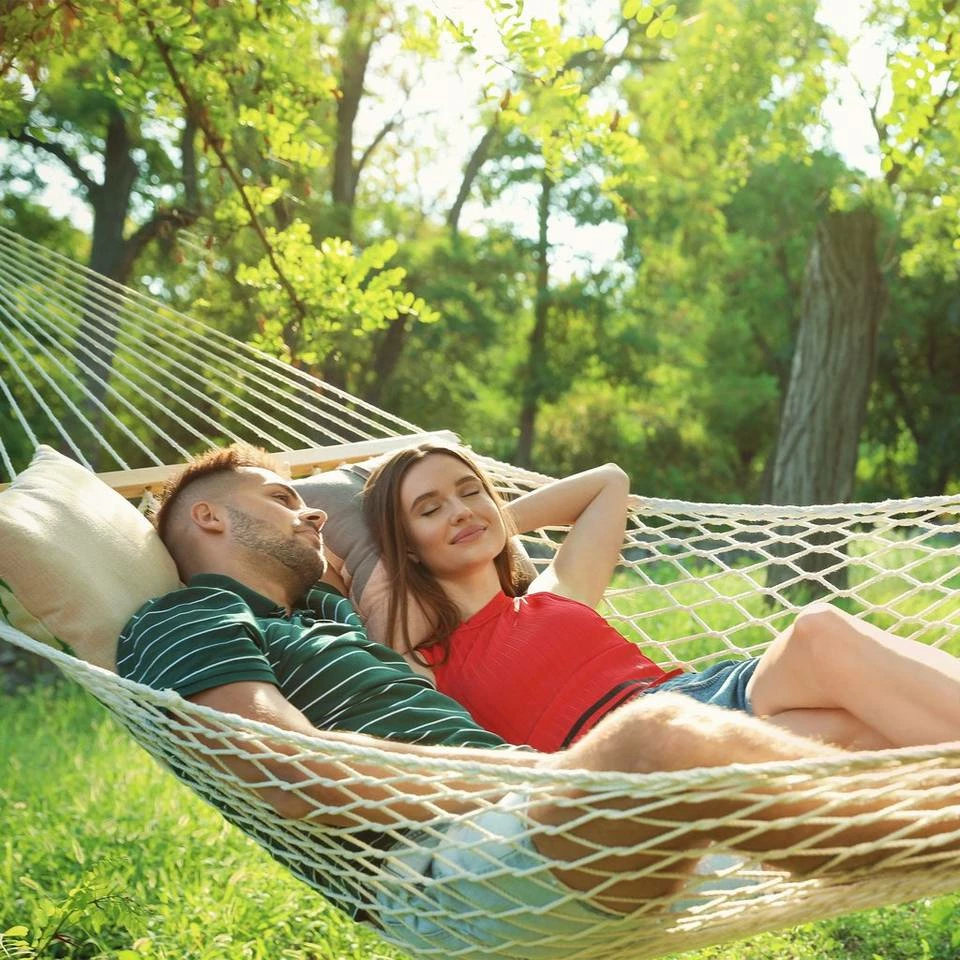 - Gemütlich abhängen: Gönnen Sie sich etwas Ruhe oder genießen Sie die Aussicht in der Netz Hängematte