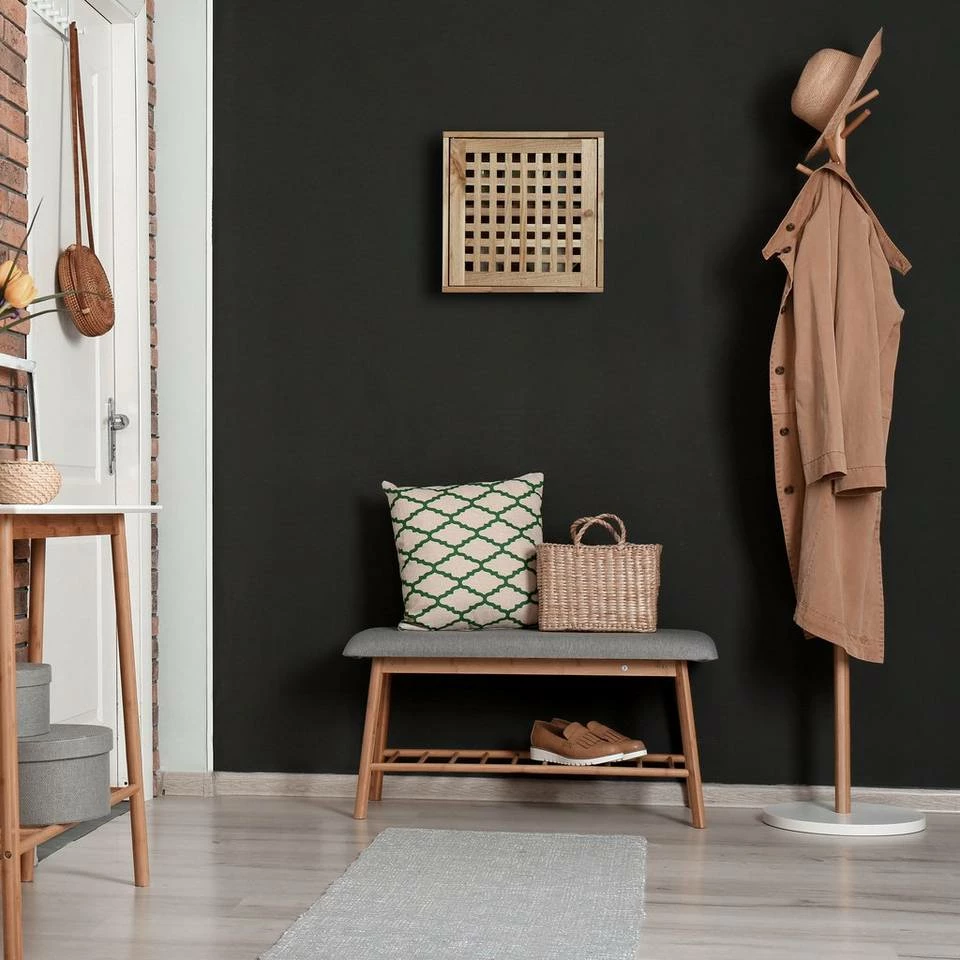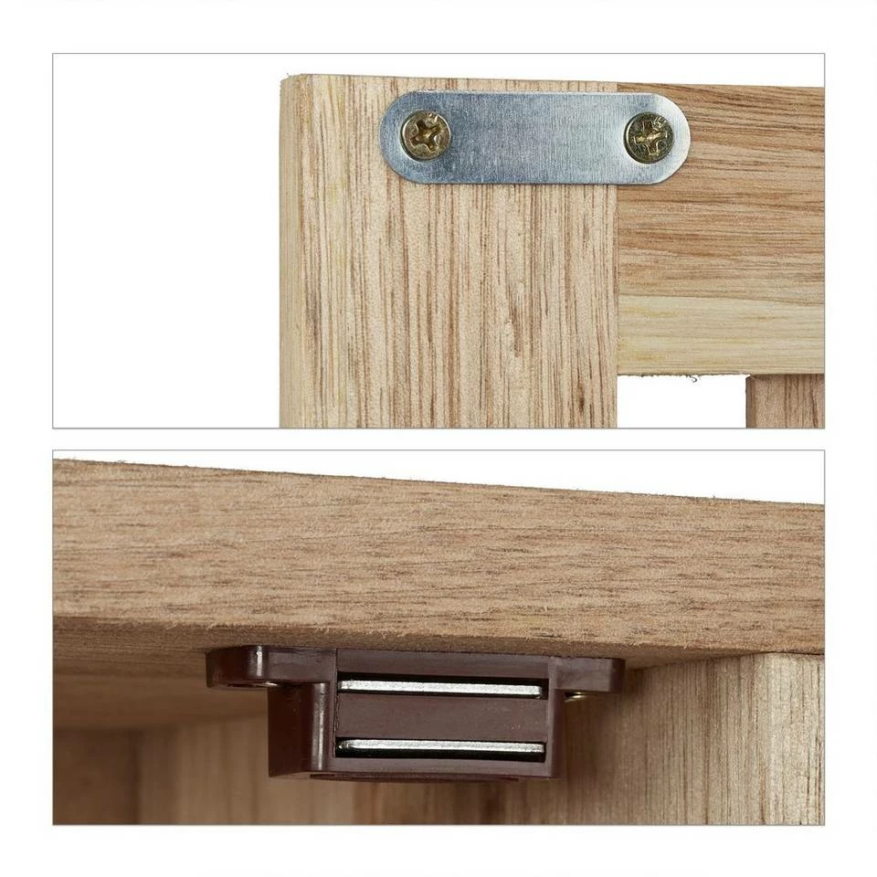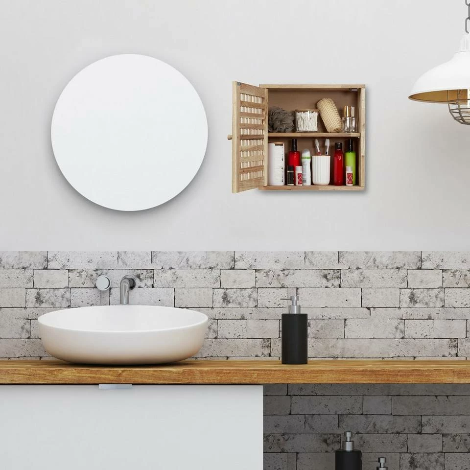 Schmaler Badezimmerschrank aus Holz Der kompakte Badwandschrank mit Tür in dekorativer Gitteroptik ist ideal für kleine Badezimmer oder das Gästebad. Platzsparend und doch geräumig bietet das Badezimmerschränkchen auf 2 Ebenen Platz für Duschbad, Lotionen, Parfums und weitere Badaccessoires. Die Schranktür bleibt dank Magnetverschluss sicher verschlossen. Der Wandschrank aus edlem Walnussholz schafft auch in Flur und Küche praktischen Stauraum.