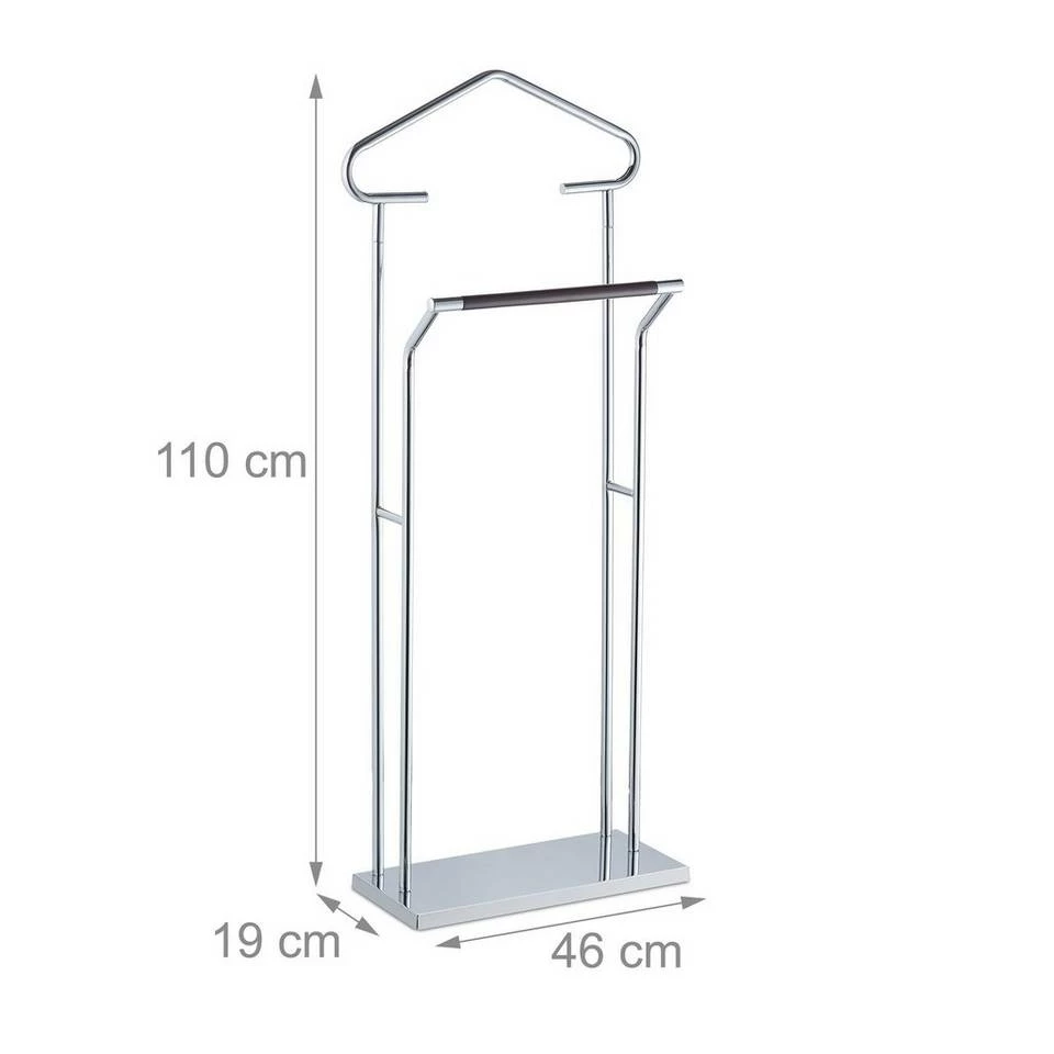 Kleiderbutler mit 2 Stangen Auf dem eleganten Kleiderhalter bewahren Sie Ihren besten Anzug knitterfrei auf. Das Jackett hängen Sie auf den großen Kleiderbügel, während die Hose ordentlich auf die vordere Stange gehängt wird. Auch zum Ablegen von Schal und Krawatte ist die Hosenstange perfekt. Dank des breiten Standfußes steht der freistehende Stumme Diener stabil. Das glänzende Design aus verchromtem Metall mit dem Kontrast der Hosenstange in Holzoptik ist ein Blickfang im Schlaf- und Ankleidezimmer oder im Flur.