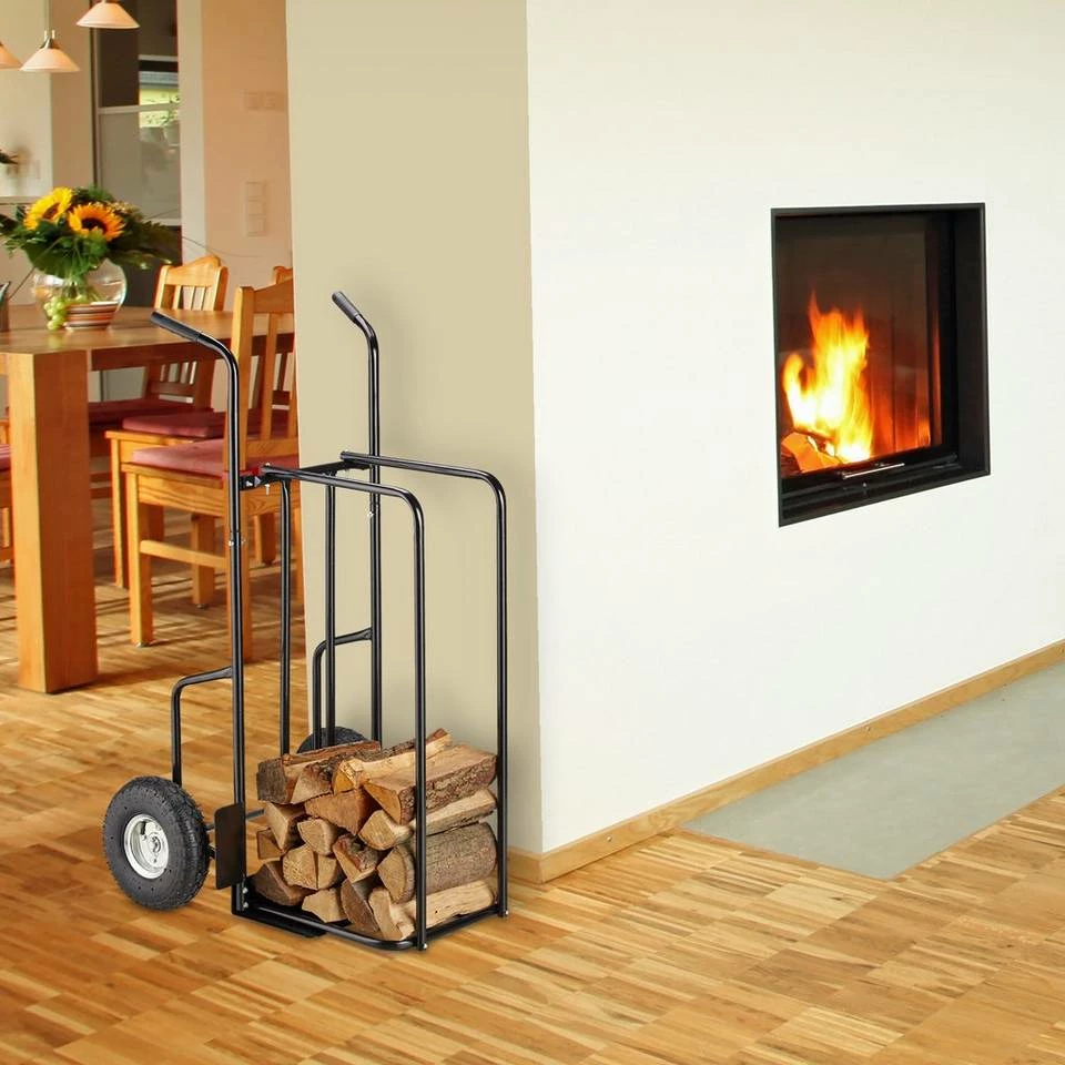 Holzwagen zum einfachen Transport von Feuerholz Mit diesem praktischen Kaminzubehör wird mehrmaliges Laufen & Tragen von schweren Holzstücken zur Geschichte. Der große Feuerholzwagen lässt Sie die Scheite ganz einfach von A nach B bringen. Stapeln Sie dazu einfach das Brennholz auf dem Transportwagen & nutzen Sie die Griffe zum bequemen Schieben. Die 2 großen Lufträder erleichtern die Fahrt zusätzlich & auch die Aufbewahrung im Stand wird dank des stabilen Stahlgestells möglich. Hohe Belastungen stellen kein Problem für den Kaminwagen dar.