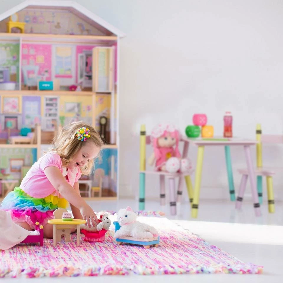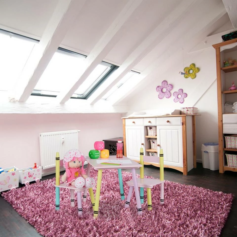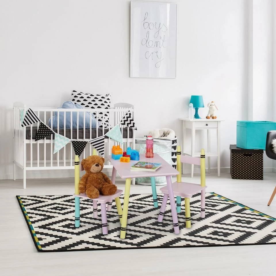 - Design: Kinderspieltisch und Kinderzimmerstühle im Wachsmalstift-Design – Farbenfroher Blickfang