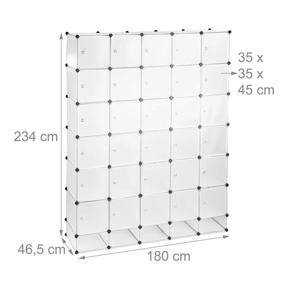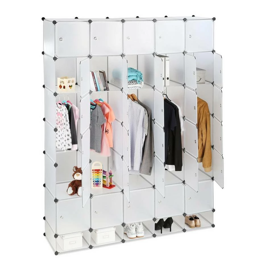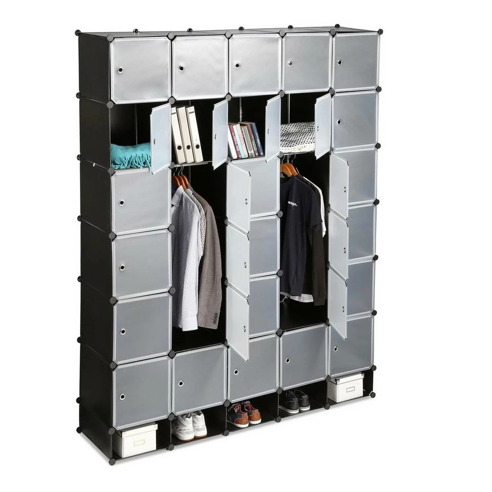 XXL Kleiderschrank Stecksystem für mehr Platz Mit 25 Fächern und einer Gesamthöhe von über 2 Metern überzeugt dieser Kleiderschrank vor allem mit seinem Stauraum. Schmale Fächer für Schuhe, viele tiefe Fächer für Hosen, Pullover und mehr und insgesamt 5 Kleiderstangen an denen Blusen, Kleider und Anzüge Platz finden. Somit haben Sachen Ihrer ganzen Familie in dem großen Faltschrank einen sicheren Aufbewahrungsort. Auch für 5er WGs oder modebewusste Frauen, die gerne die Mode der letzten Jahrzehnte angesammelt haben, ist dieser Koloss von einem Schrank genau das Richtige. Das flexible Stecksystem ermöglicht einen problemlosen Umbau oder auch eine Umgestaltung der Anordnung. Bauen Sie sich beispielsweise ein Treppenregal und ein kleines Schuhregal. Hinweis: Regal bei Raumtemperatur aufbauen, um Verbindungsstücke biegsam zu halten