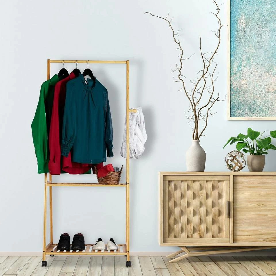 Praktische Rollgarderobe aus Bambus Mit der rollbaren Garderobe bewahren Sie Ihre Kleidung ordentlich sortiert auf – ob im Flur, Büro oder Schlaf- und Ankleidezimmer. Die lange Kleiderstange bietet ausreichend Platz, um Hemden, Blusen oder Jacken an Kleiderbügeln aufzuhängen. Auf den 2 Ablagen platzieren Sie Schuhe und Stiefel oder bewahren Ihre Schals und Tücher gefaltet in Boxen auf. Handtaschen können bequem an den 4 Haken verstaut werden. Durch die natürlich warme Optik ist der Garderobenwagen in jeder Wohnung ein Hingucker.