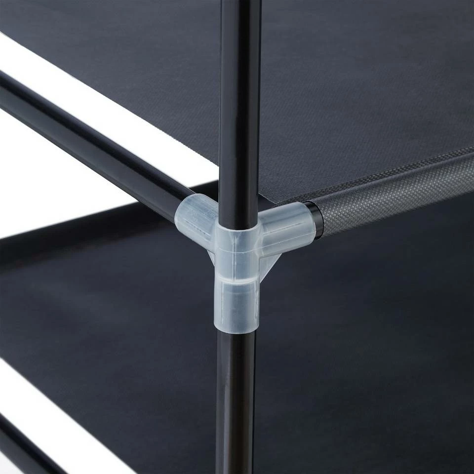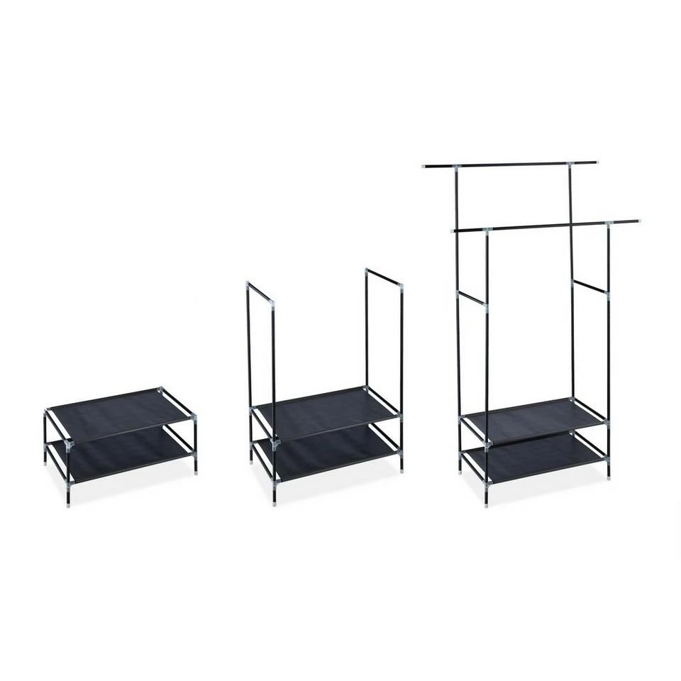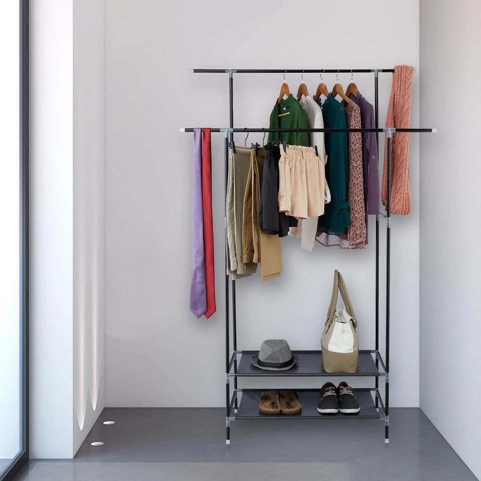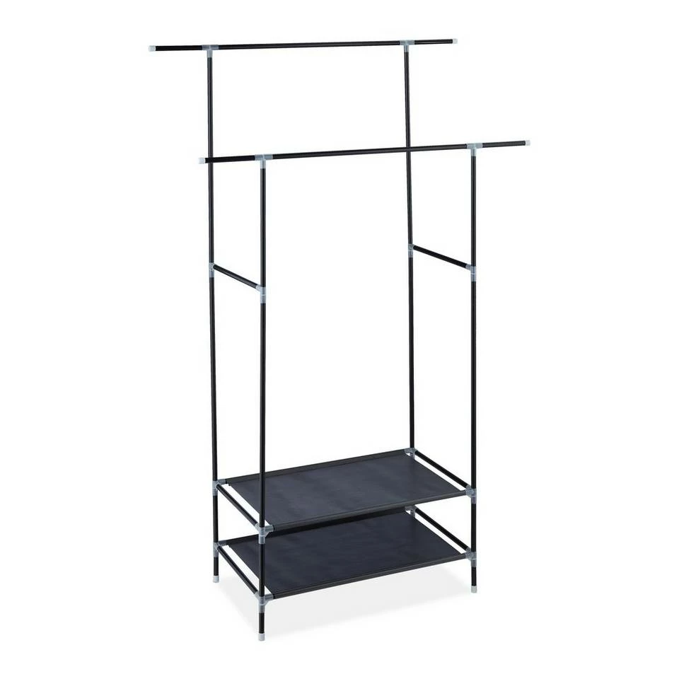 Doppelkleiderständer mit Stangen und Ablagen Mit diesem Klamottenständer aus Metall schaffen Sie innerhalb kürzester Zeit neuen Stauraum für Ihre Kleidung. Das Garderobengestell ist dank Stecksystem schnell auf- und abgebaut und kann so sowohl als dauerhafter Kleidungsständer als auch als flexible Übergangslösung eingesetzt werden. Auf 2 Kleiderstangen und 2 Stoffablagen finden Sie ausreichend Platz für Jacken, Hemden, Blusen, Kleider, Schuhe, Taschen und diverse andere Kleidungsstücke.