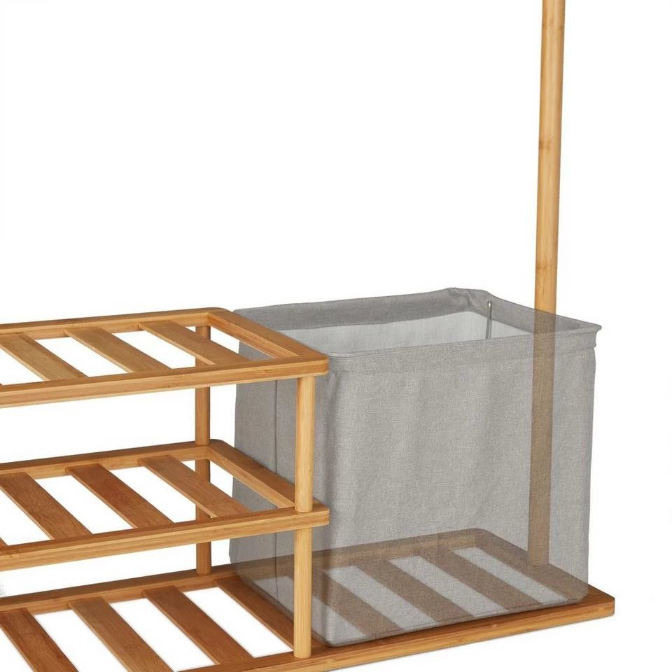 Vielseitiger Garderobenständer mit Kleiderstange, Schuhablagen & mehr Dieser moderne Bambus Garderobenständer überzeugt mit funktionalem Design. Die Fertigung aus natürlichem Bambus setzt warme Akzente im Schlaf- oder Ankleidezimmer, Bad sowie Flur, wo der Kleiderständer eine gute Figur macht. Auf der Garderobenstange können bequem Blusen, Hemden oder Jacken aufgehangen werden, während die 3 Ablagen Platz für Schuhe, Taschen oder Aufbewahrungsboxen schaffen. Dank der faltbaren Stoffbox sind auch Schals, Gürtel, Handschuhe und vieles mehr griffbereit untergebracht.