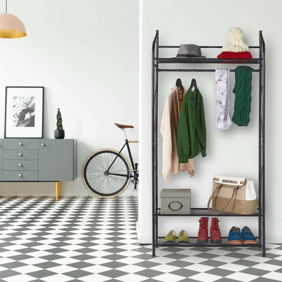 Offener Kleiderschrank im Vintage Stil Der Garderobenständer wird nicht nur zum neuen Blickfang in Ihrem Flur oder Schlafzimmer, dank vieler Ablagemöglichkeiten sorgt er gleichzeitig für Ordnung. Nutzen Sie die unteren Fächer bspw. als kleines Schuhregal oder zur Aufbewahrung von Ordnungsboxen. Die obere Ebene eignet sich vor allem als Hutablage oder für Mützen und Schals. An der Kleiderstange finden zusätzlich Hemden, Blusen oder Jacken ihren Platz. Mit dem schlichten Vintage Design fügt sich die Standgarderobe in jede Einrichtung.