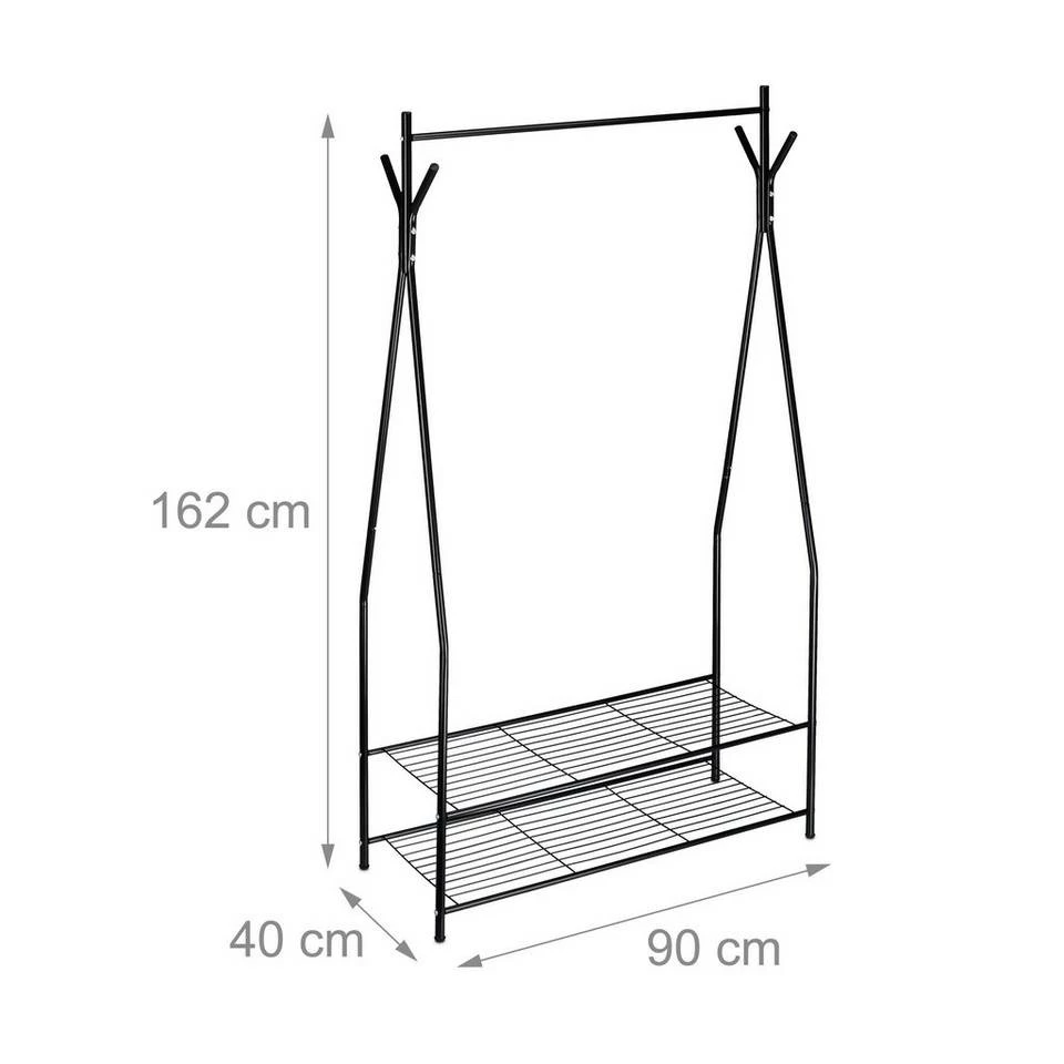 Kleiderständer mit Schuhablage Die Vertreter der SANDRA Serie schaffen Ordnung in Ihrem Flur. Sie bestehen aus robustem, pulverbeschichtetem Stahlrohr. Die verschiedenen Farben passen sich dabei elegant und stilvoll in Ihre Einrichtung. Dieser Kleiderständer SANDRA ist mit 90 cm extra breit. Auf seinen beiden Schuhablagen finden bis zu 8 Paar Schuhe Platz. Dabei können im oberen Fach auch Stiefel abgestellt werden. Die Kleiderstange bietet zusammen mit den 4 Kleiderhaken genug Platz für Winterjacken, Mäntel, Kleider oder Hemden. Damit der Fußboden Ihrer Wohnung nicht zerkratzt wird, verfügen die Füße über Gummi-Untersetzer.