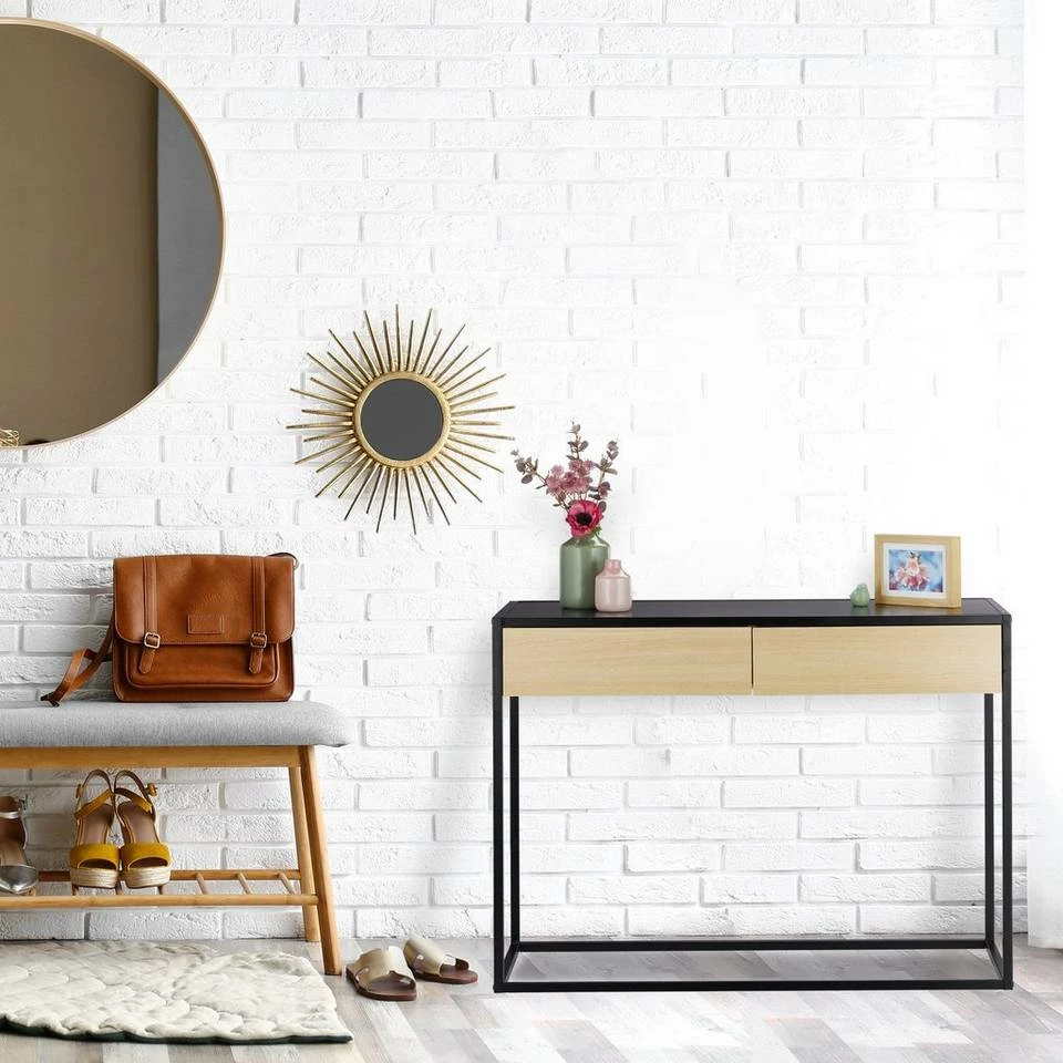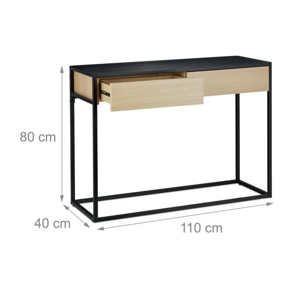 - Dekorativ: Moderner Flurtisch mit schwarzem Metallgestell und Schubfächern in heller Eichenoptik