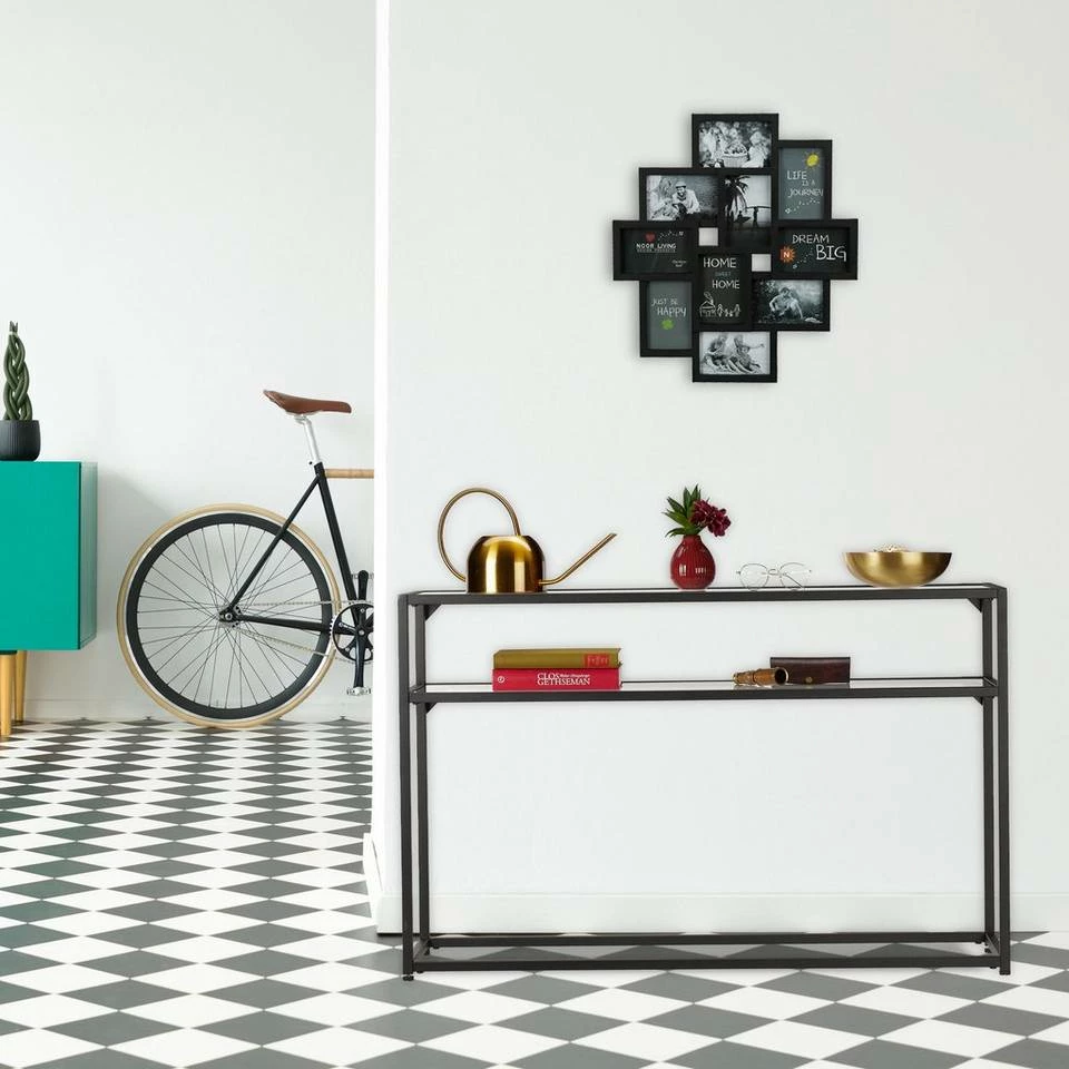 - Dekorativ: Flurtisch mit schwarzem Metallgestell sowie Ablagen aus Glas – Moderne und schlichte Optik