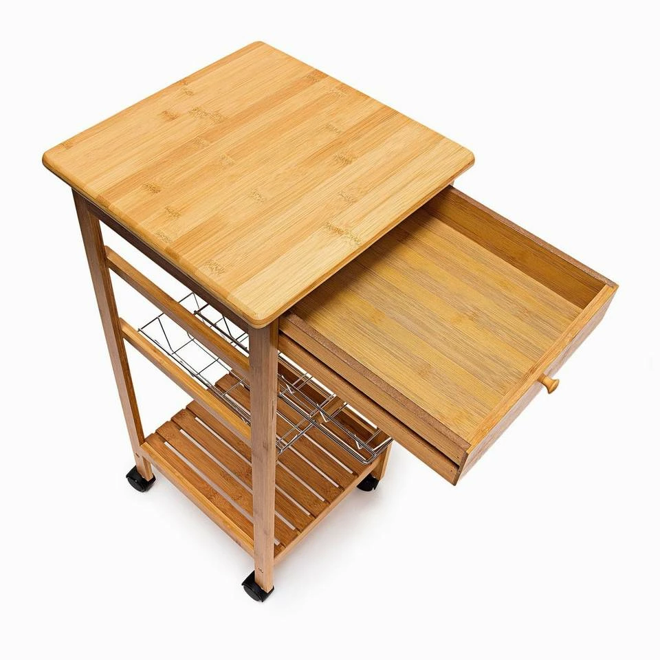 Kleiner Küchenwagen aus Bambus Schaffen Sie sich mobilen Stauraum für Ihre Küche. Mit den Servierwagen der JAMES Reihe können Sie ohne Probleme Geschirr, Gläser, Obst und vieles mehr transportieren und schnell an den Essenstisch oder das Bett fahren. Der hochwertig verarbeitete Bambus verströmt dabei ein rustikales Flair und fügt sich freundlich und warm in Ihre Einrichtung. Der Küchenrollwagen der Größe S ist der kleinste der Serie und überzeugt mit seiner geringen Stellfläche. Er verfügt über 2 Körbe aus Metallgitter, die Sie einfach entnehmen und auch separat benutzen können.